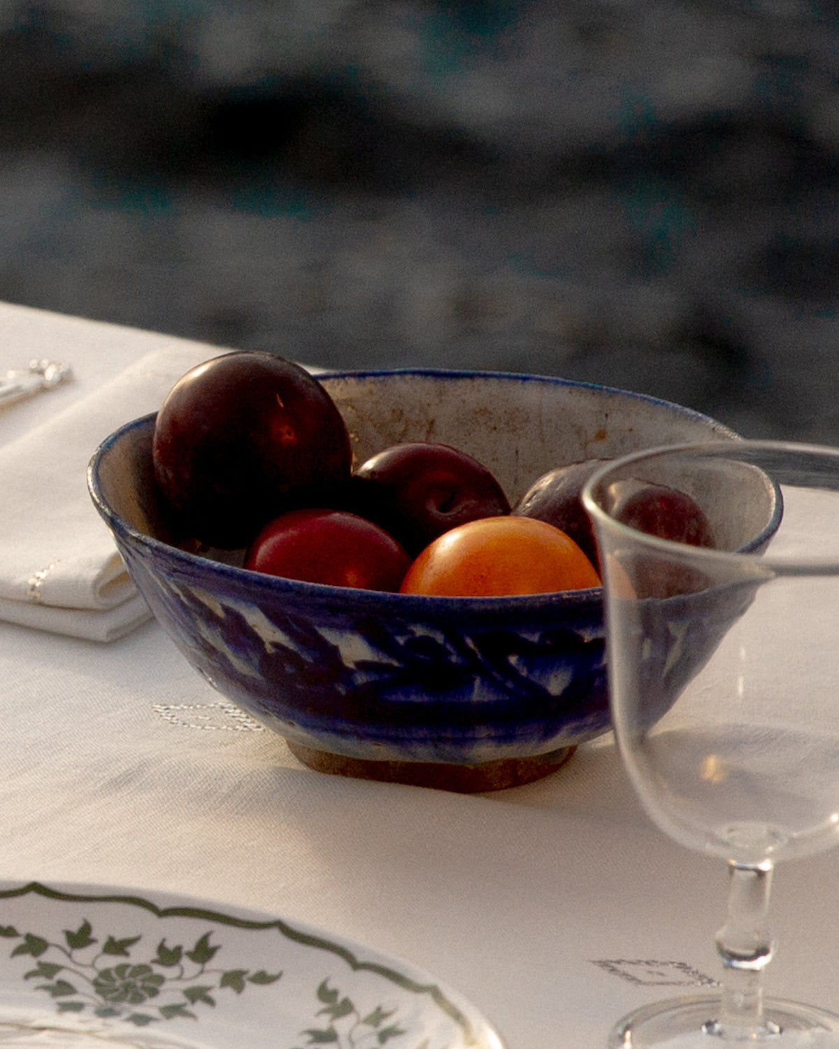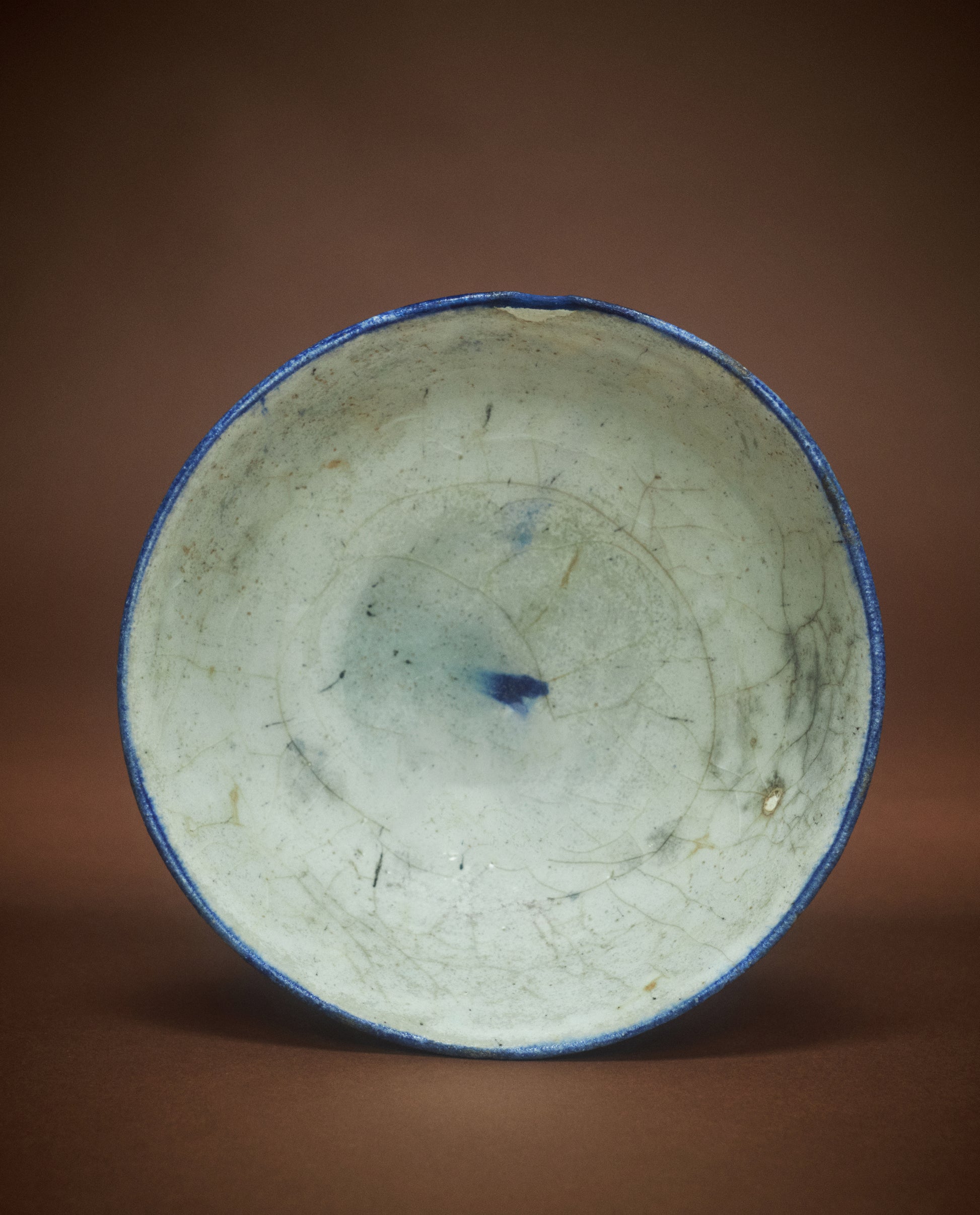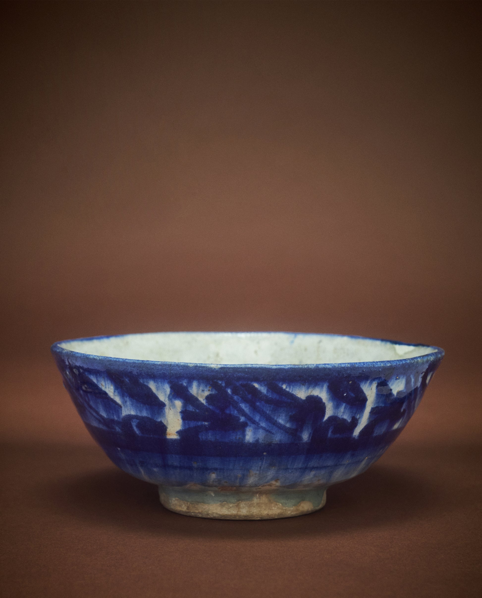 Crafted by Kashan potters during the late Safavid period (c. 1700s), this collection of bowls features the Persian invention of under glaze painting with cobalt blue ore. The bleeding quality reflects a Silk Road intermingling of influences between Chinese ceramics and the development of fine pottery in the Islamic World. The result is a wash of deep blue color, distinctive and visually dramatic.