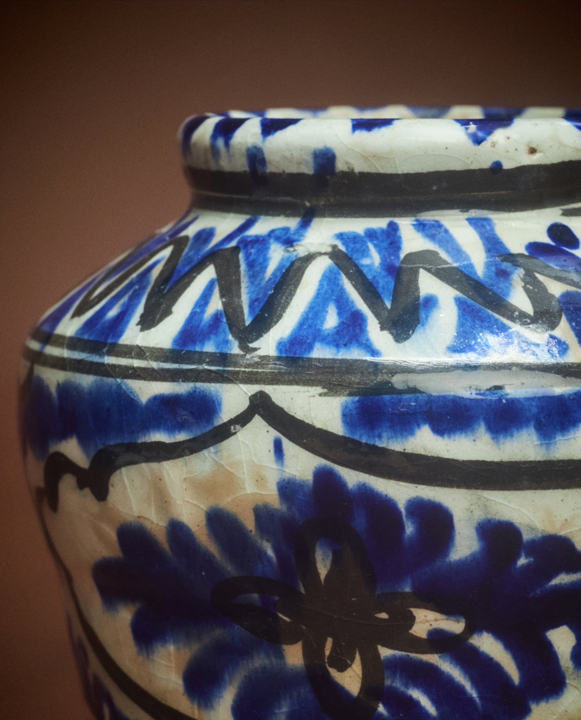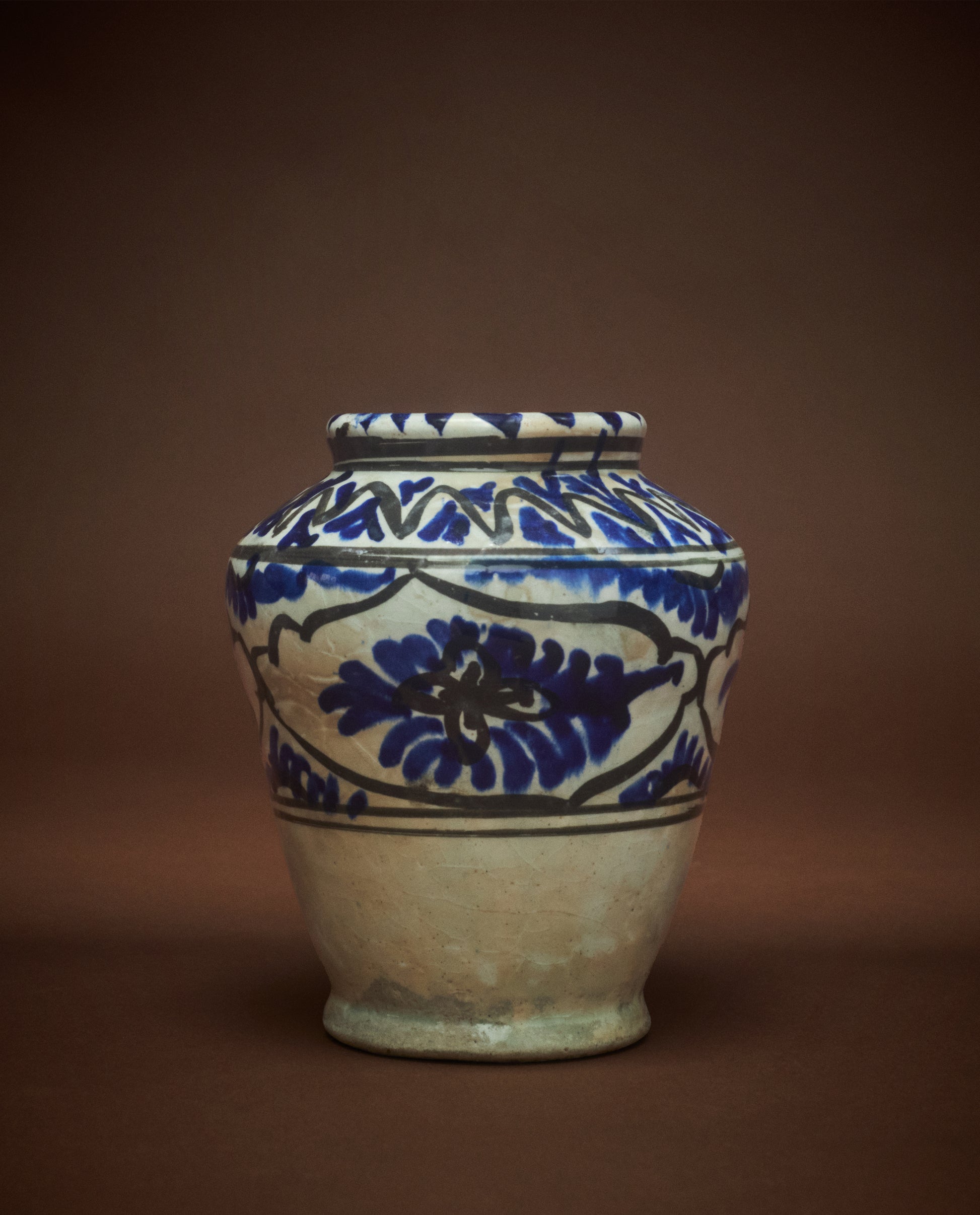 Crafted by Kashan potters during the late Safavid period (c. 1700s), this collection of vases features the Persian invention of under glaze painting with cobalt blue ore. The bleeding quality reflects a Silk Road intermingling of influences between Chinese ceramics and the development of fine pottery in the Islamic World. The result is a wash of deep blue color, distinctive and visually dramatic.