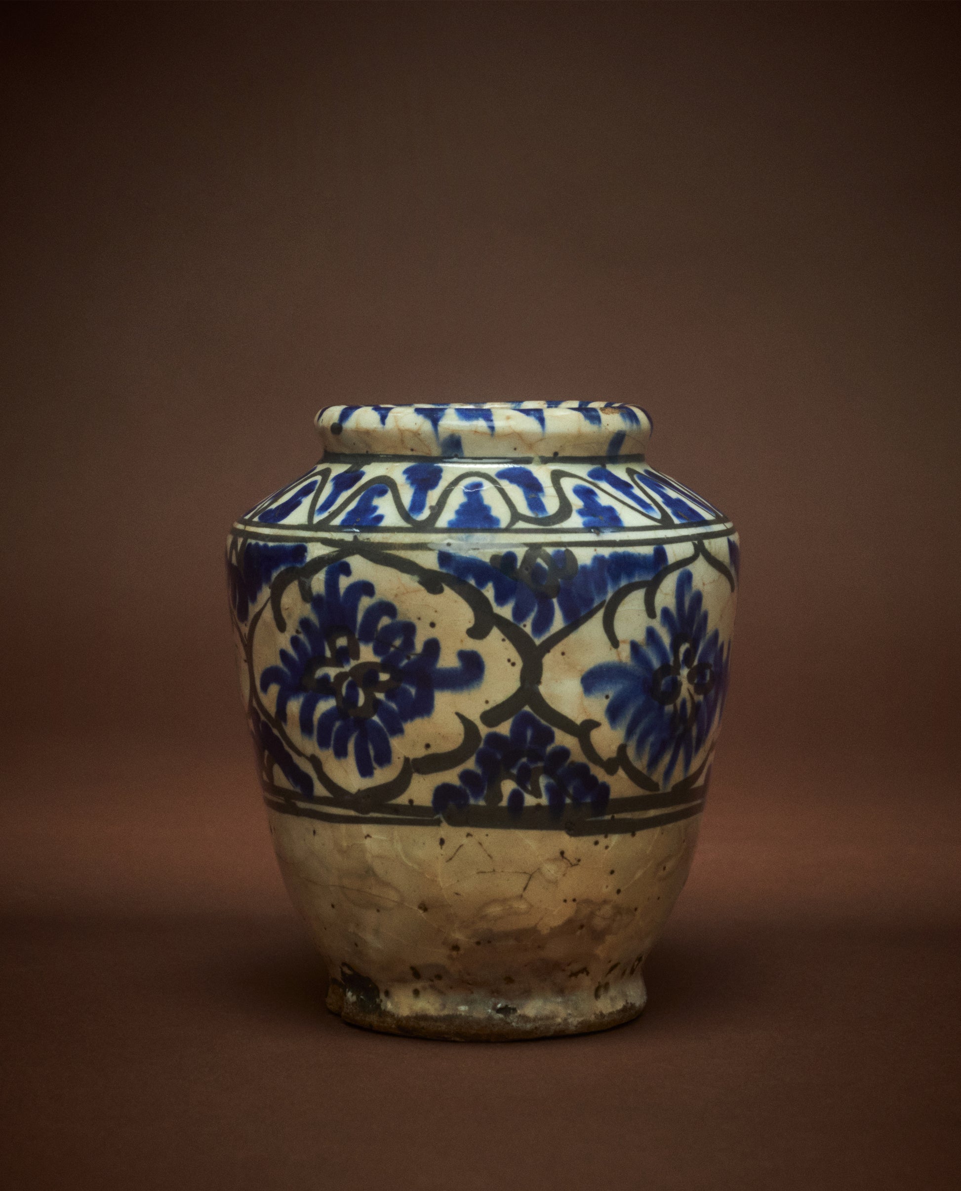 Crafted by Kashan potters during the late Safavid period (c. 1700s), this collection of vases features the Persian invention of under glaze painting with cobalt blue ore. The bleeding quality reflects a Silk Road intermingling of influences between Chinese ceramics and the development of fine pottery in the Islamic World. The result is a wash of deep blue color, distinctive and visually dramatic.