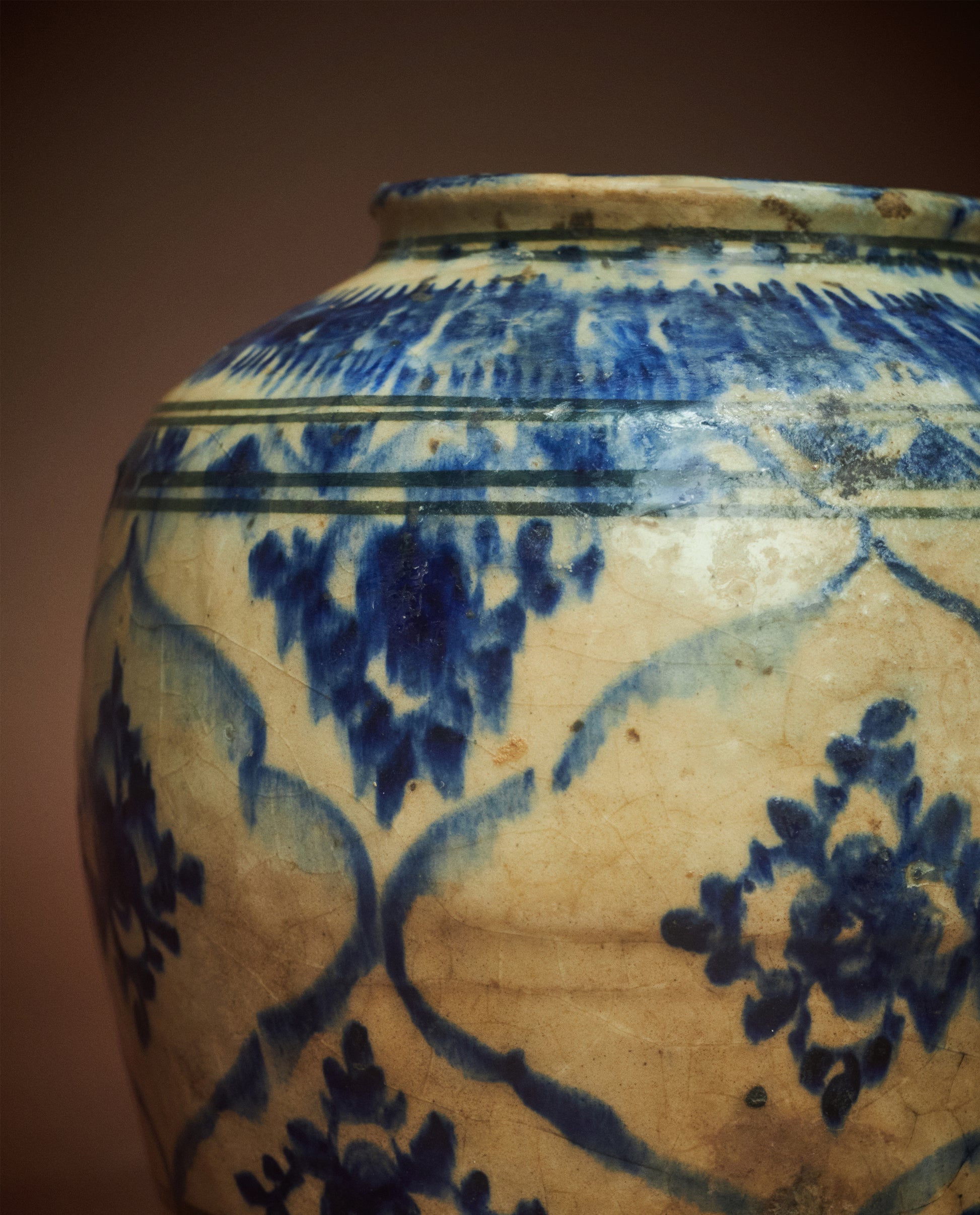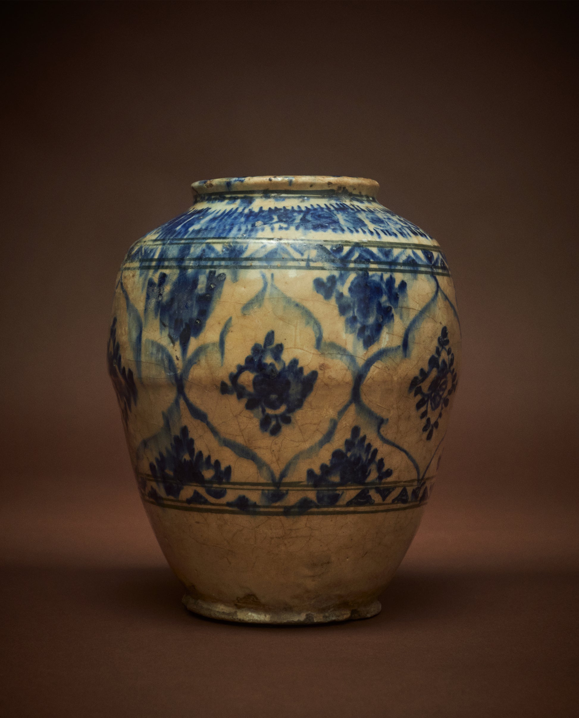 Crafted by Kashan potters during the late Safavid period (c. 1700s), this collection of vases features the Persian invention of under glaze painting with cobalt blue ore. The bleeding quality reflects a Silk Road intermingling of influences between Chinese ceramics and the development of fine pottery in the Islamic World. The result is a wash of deep blue color, distinctive and visually dramatic.
