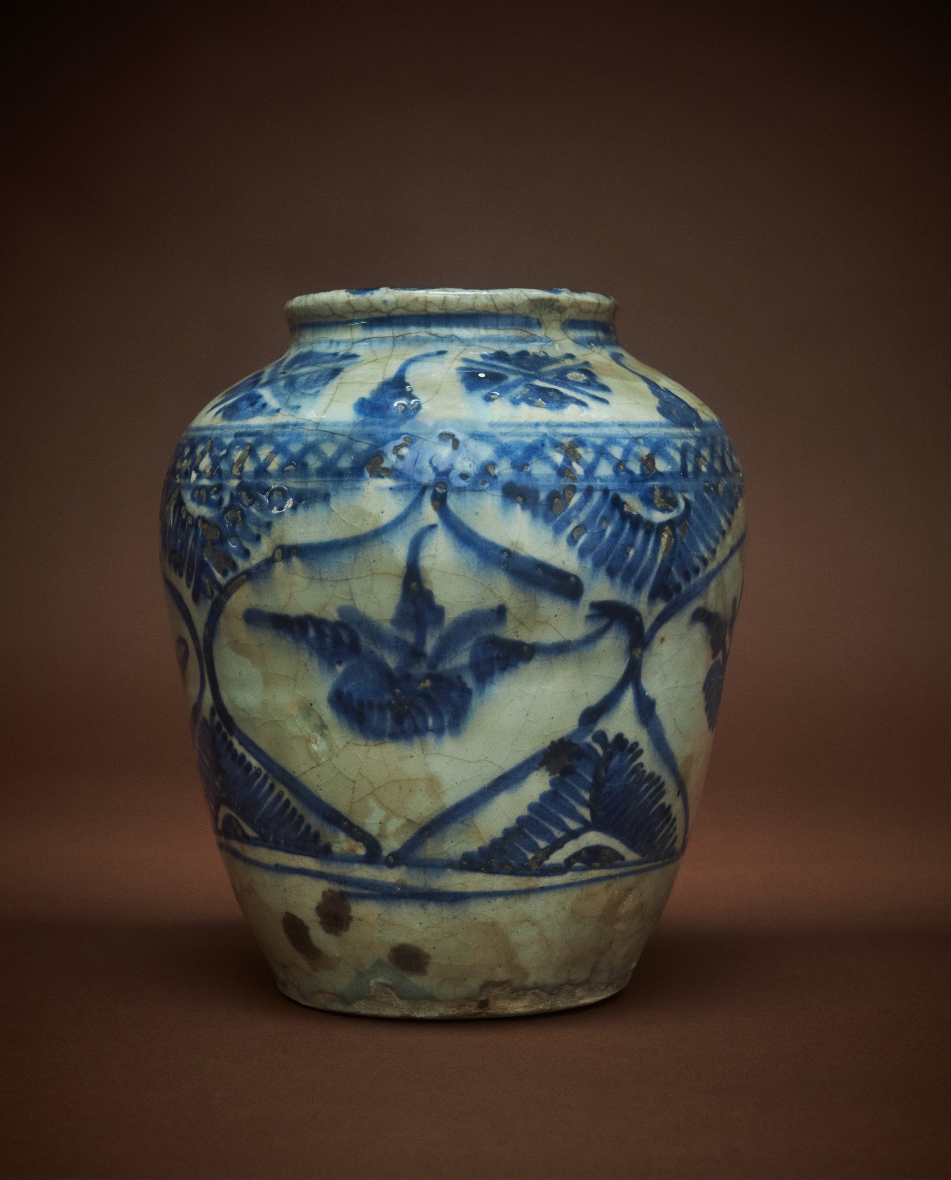 Crafted by Kashan potters during the late Safavid period (c. 1700s), this collection of vases features the Persian invention of under glaze painting with cobalt blue ore. The bleeding quality reflects a Silk Road intermingling of influences between Chinese ceramics and the development of fine pottery in the Islamic World. The result is a wash of deep blue color, distinctive and visually dramatic.