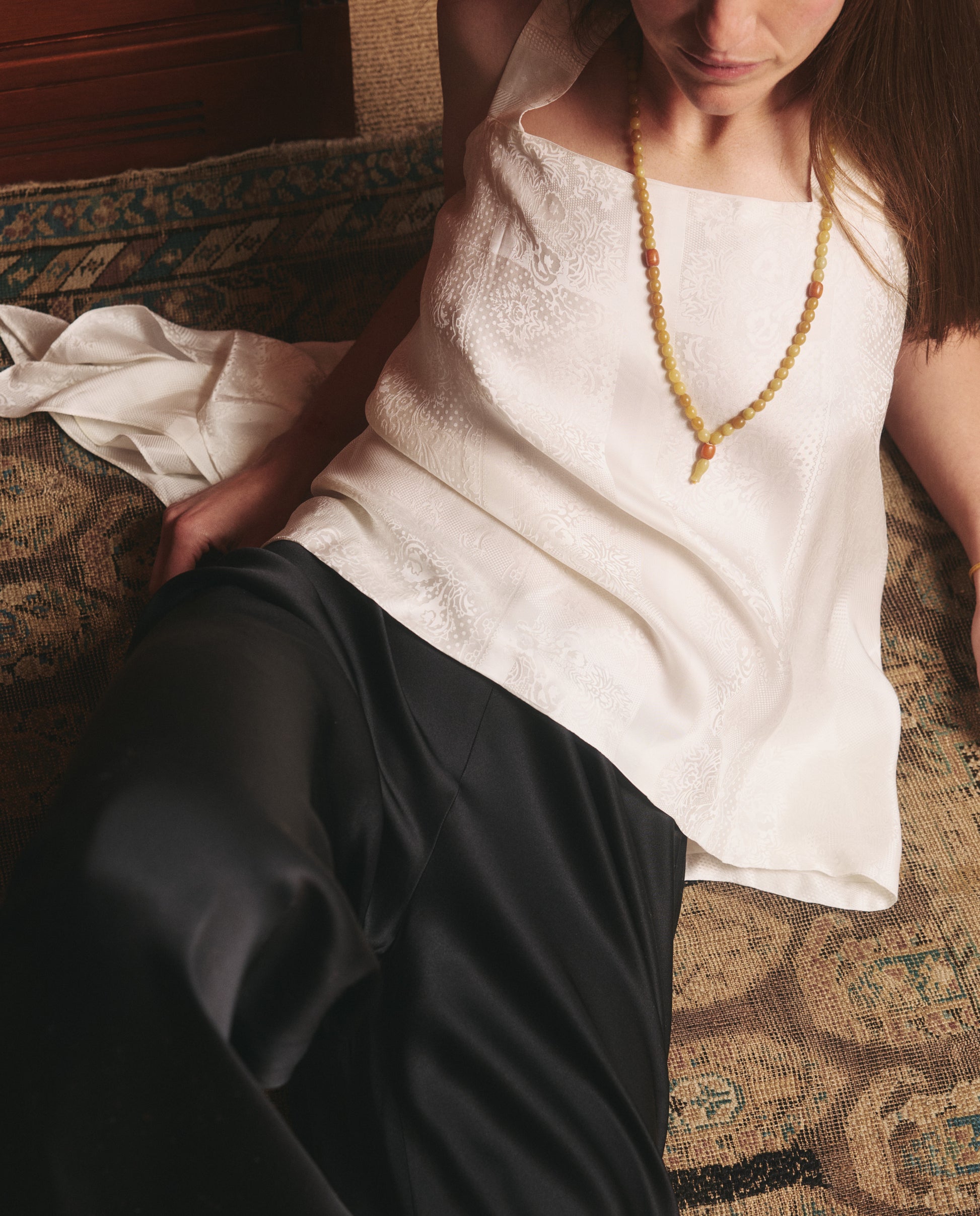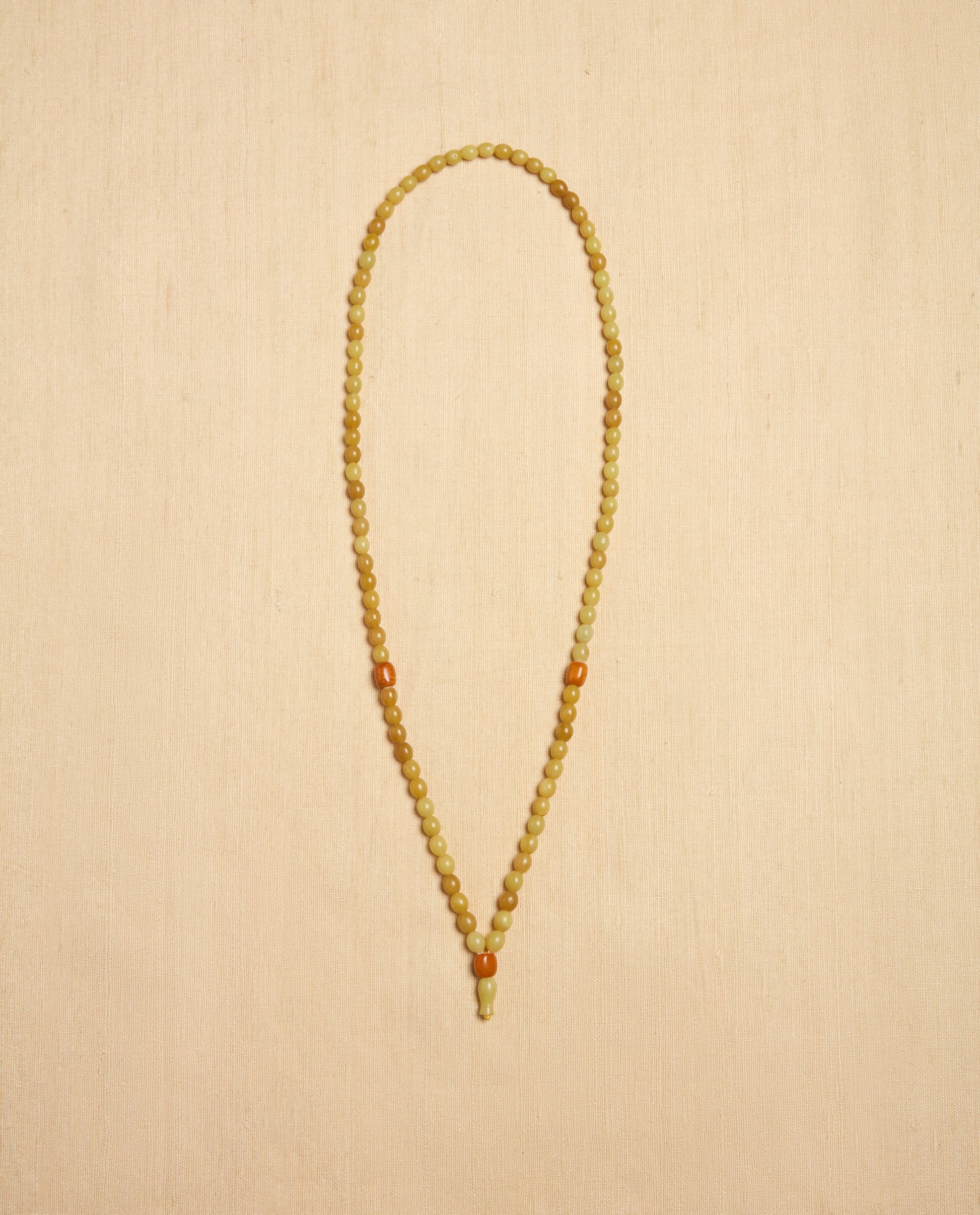 The Ancora collection comprises 25 refurbished tasbih prayer beads collected throughout the Levant - from Cairo to Istanbul. This long necklace features mixed green amber beads.