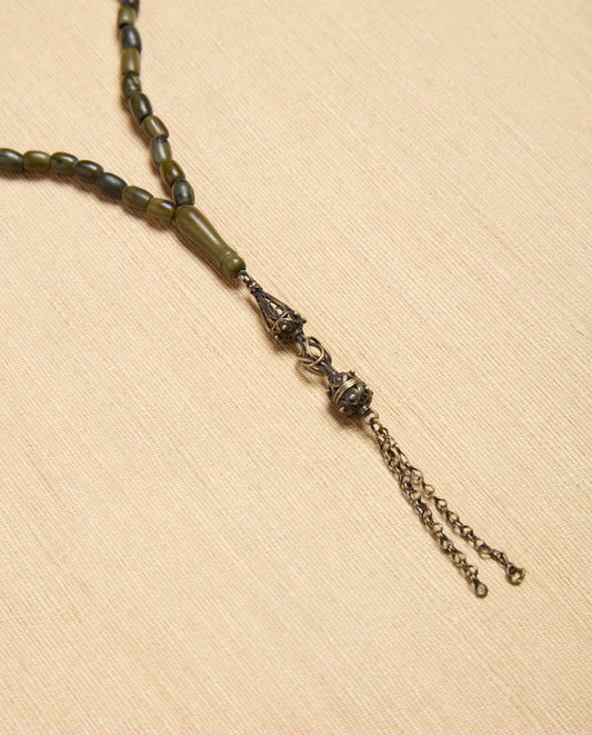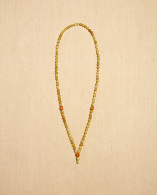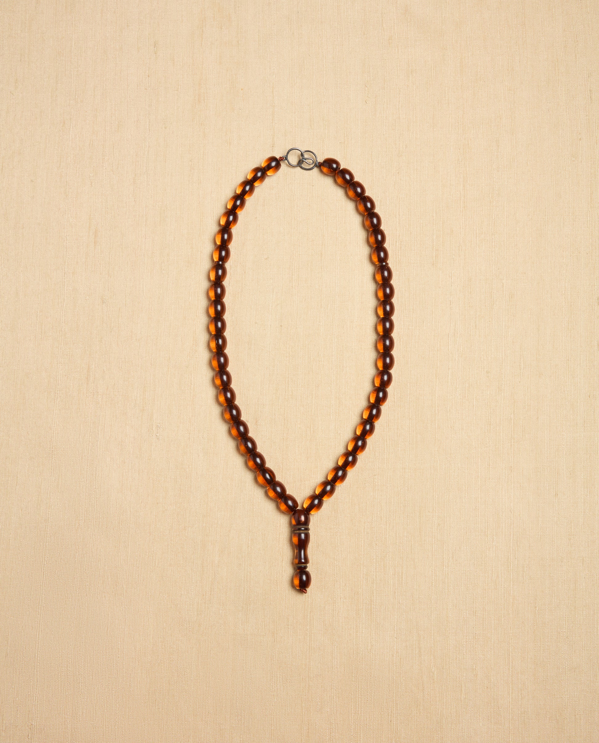 The Ancora collection comprises 25 refurbished tasbih prayer beads collected throughout the Levant - from Cairo to Istanbul. This collar features beads in deep amber colored resin with a circular silver clasp.
