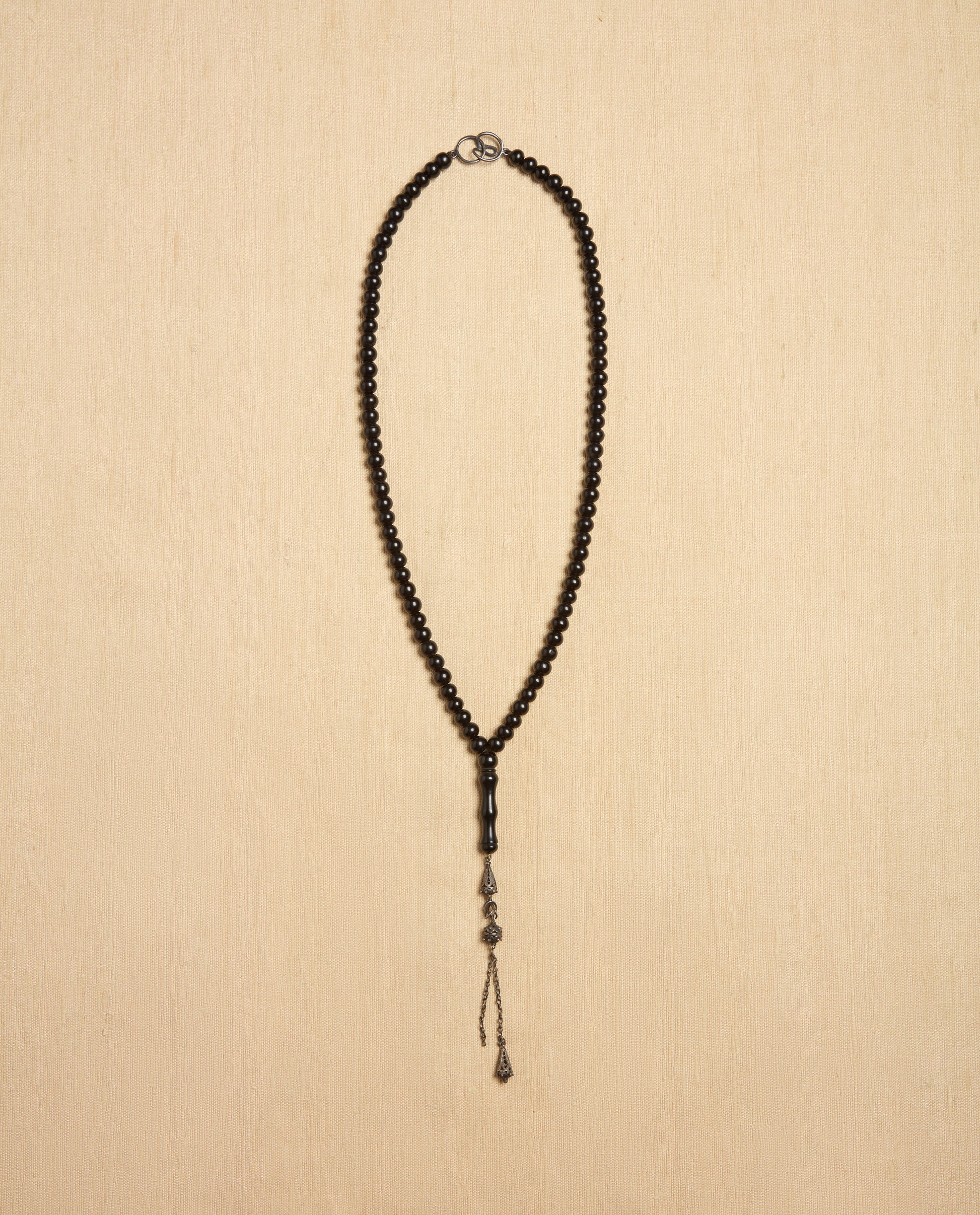 The Ancora collection comprises 25 refurbished tasbih prayer beads collected throughout the Levant - from Cairo to Istanbul. This necklace features beads in black resin with an antique silver tassel and circular silver clasp closure.