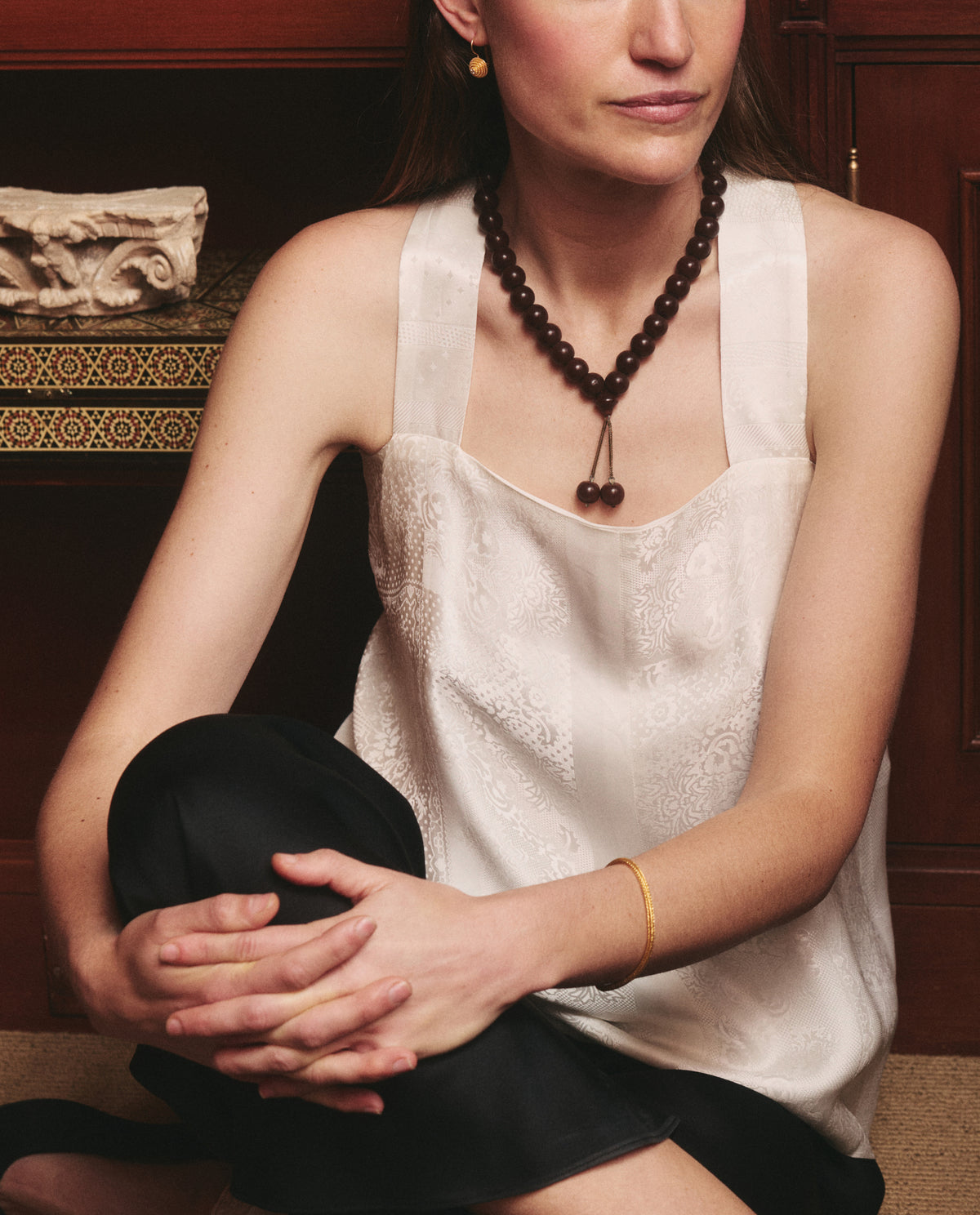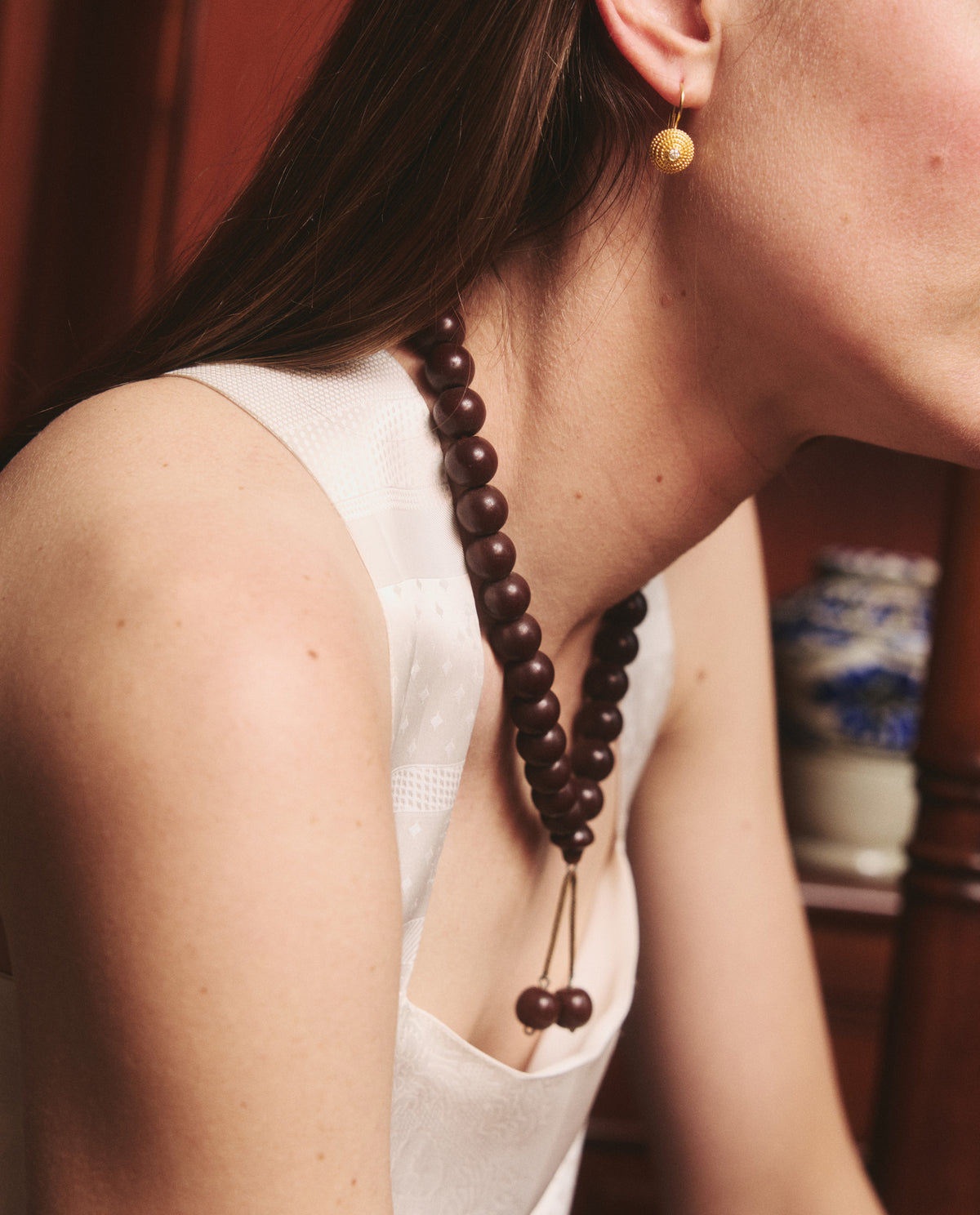 The Ancora collection comprises 25 refurbished tasbih prayer beads collected throughout the Levant - from Cairo to Istanbul. This collar features beads crafted from antique narcin bone, with hanging bead tassels and a circular silver clasp.