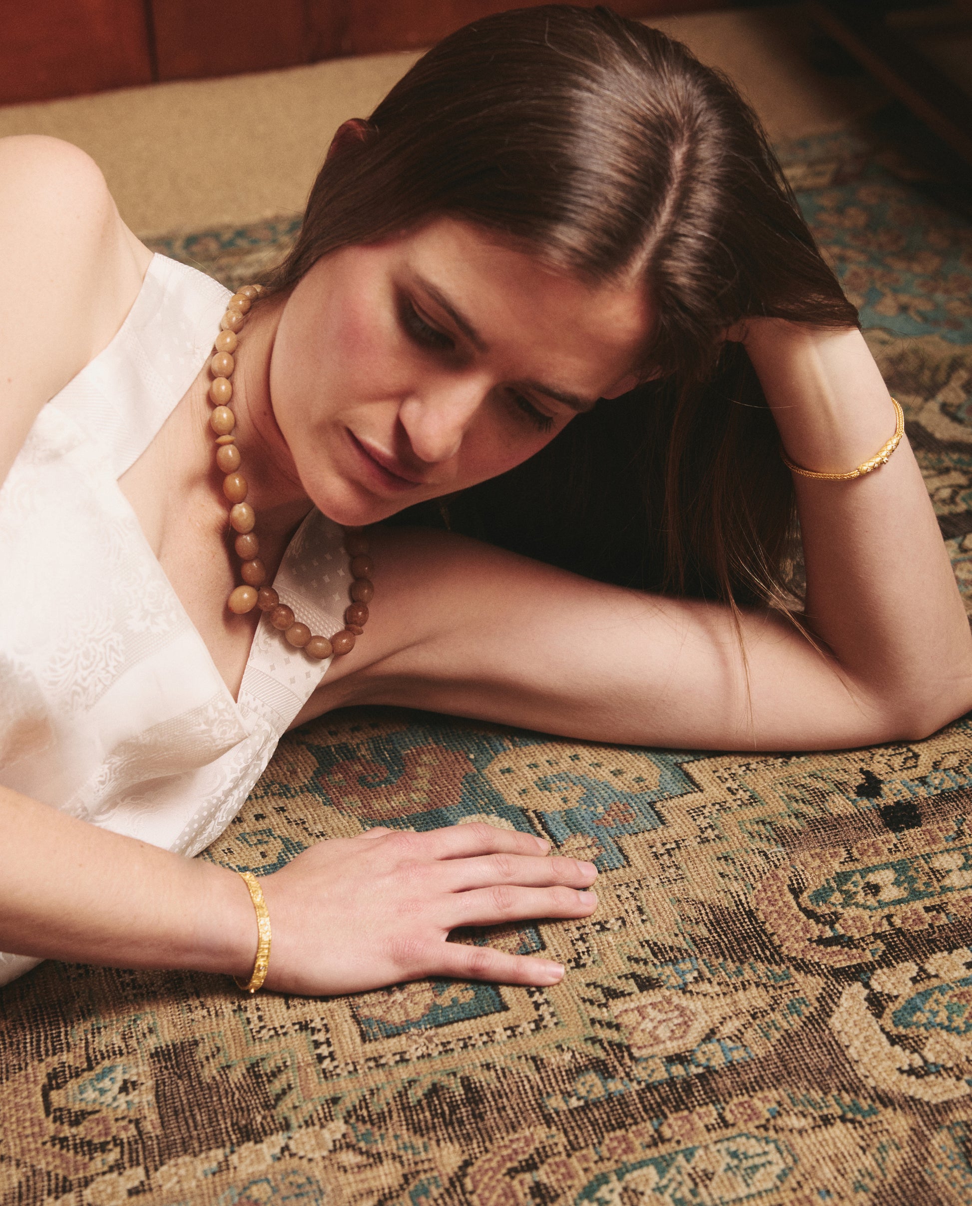 The Ancora collection comprises 25 refurbished tasbih prayer beads collected throughout the Levant - from Cairo to Istanbul. This collar features beads crafted from light brown stone, fastened with a circular silver clasp.
