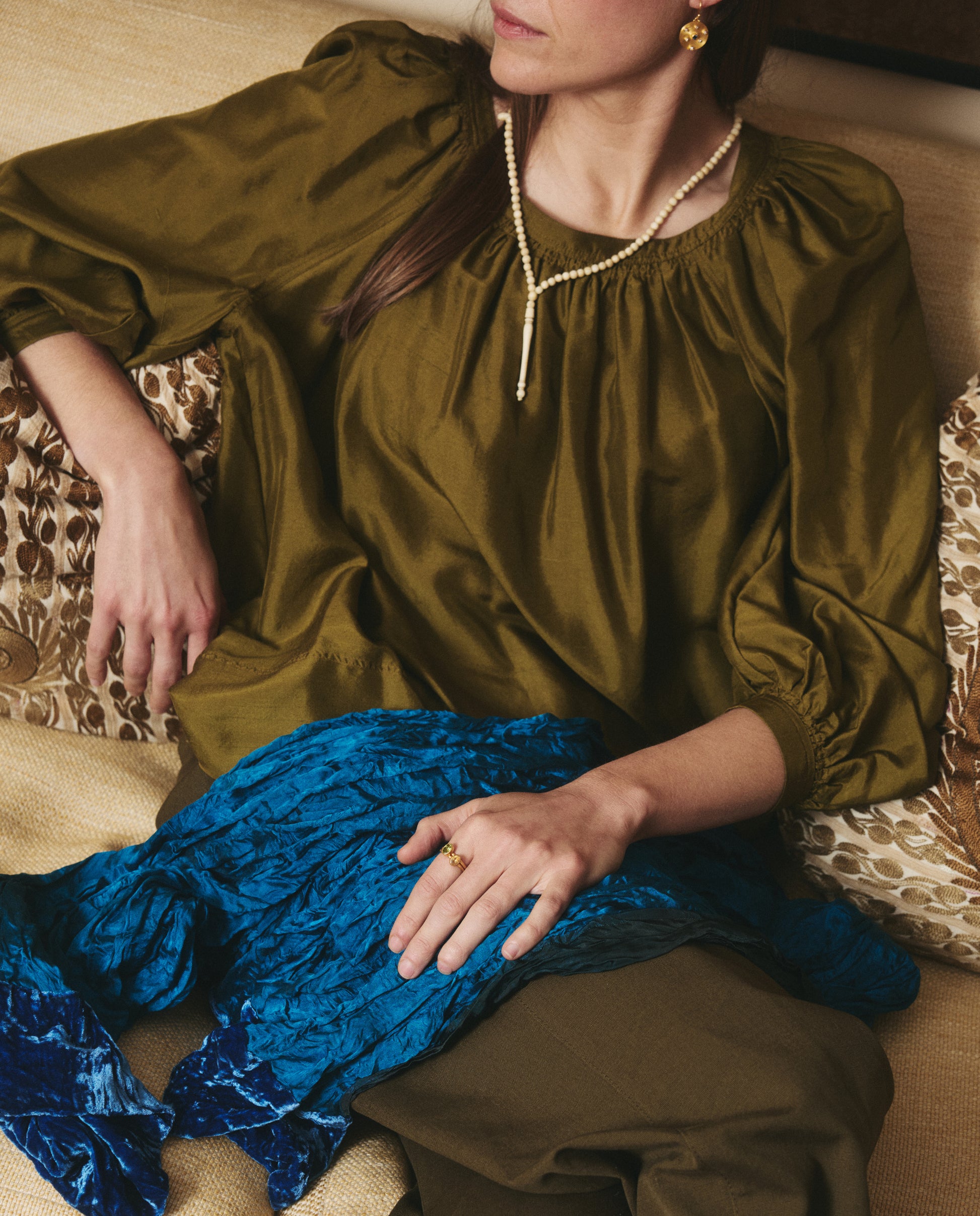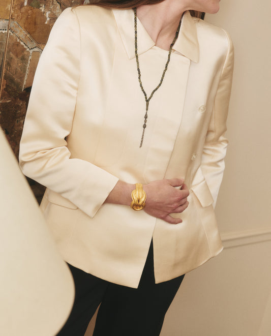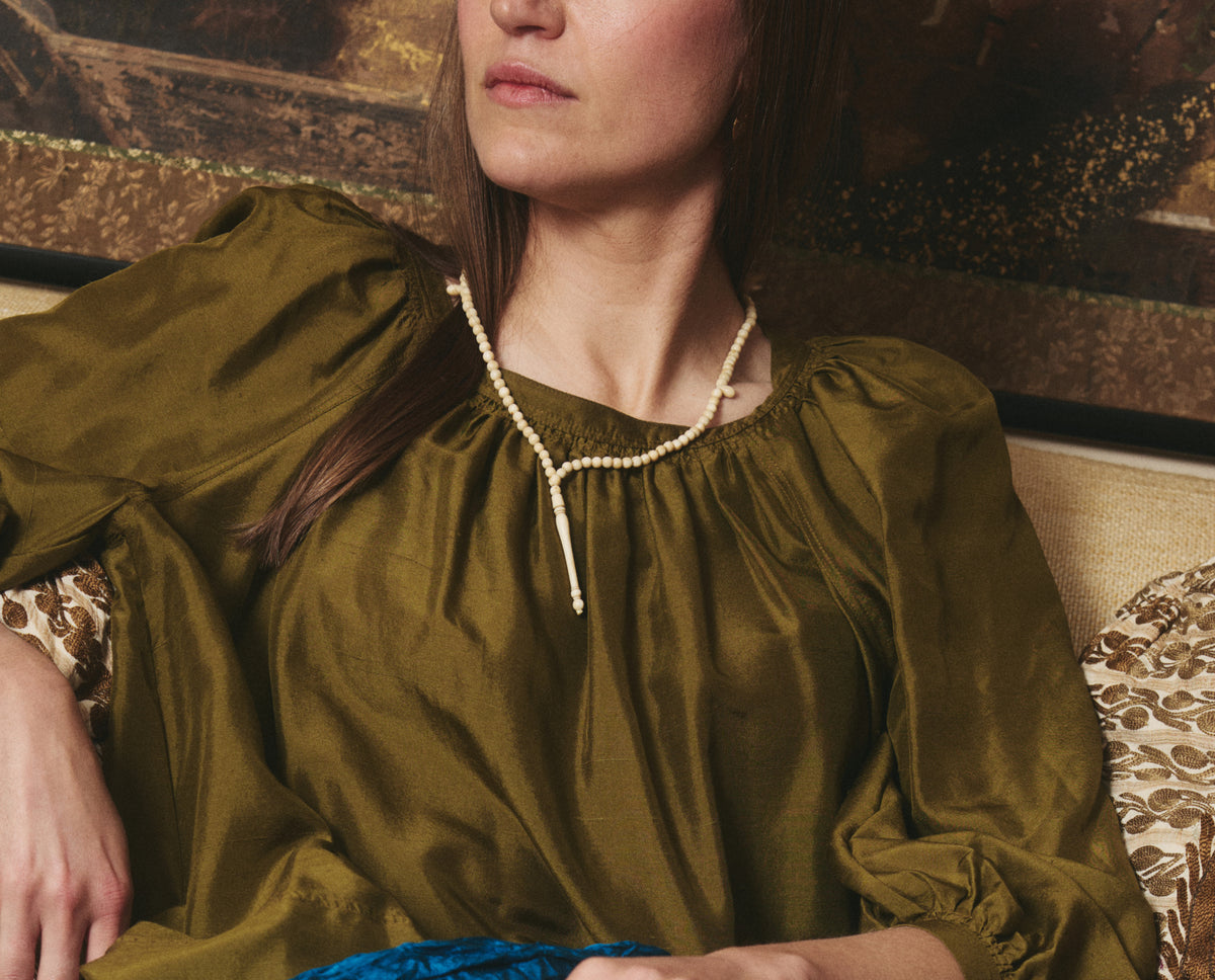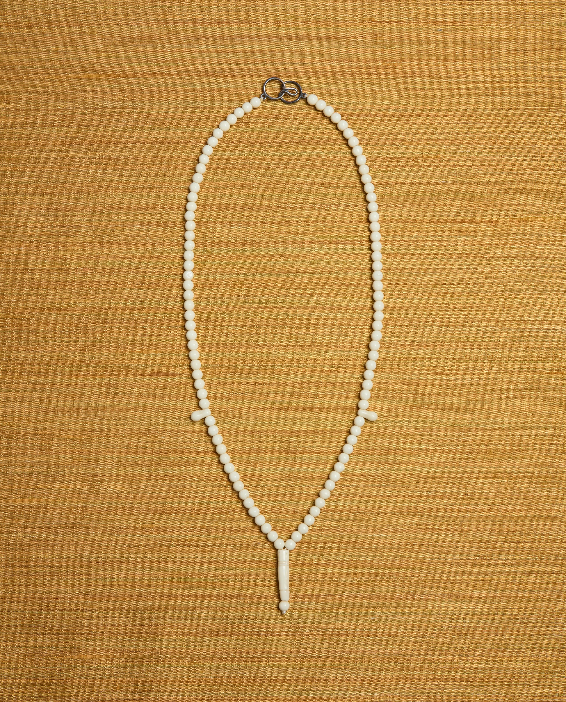 The Ancora collection comprises 25 refurbished tasbih prayer beads collected throughout the Levant - from Cairo to Istanbul. This collar features beads in white resin with a circular silver clasp.