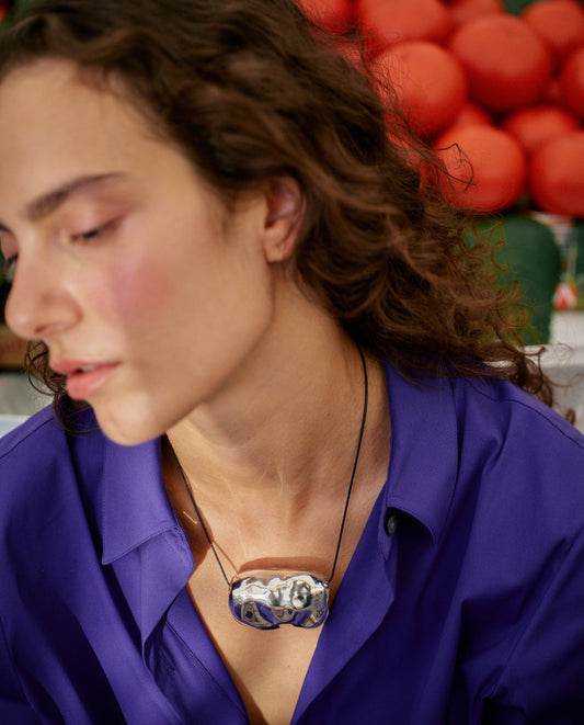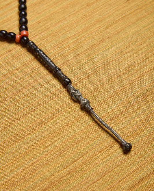 The Ancora collection comprises 25 refurbished tasbih prayer beads collected throughout the Levant - from Cairo to Istanbul. This collar features beads in orange resin with a circular silver clasp.