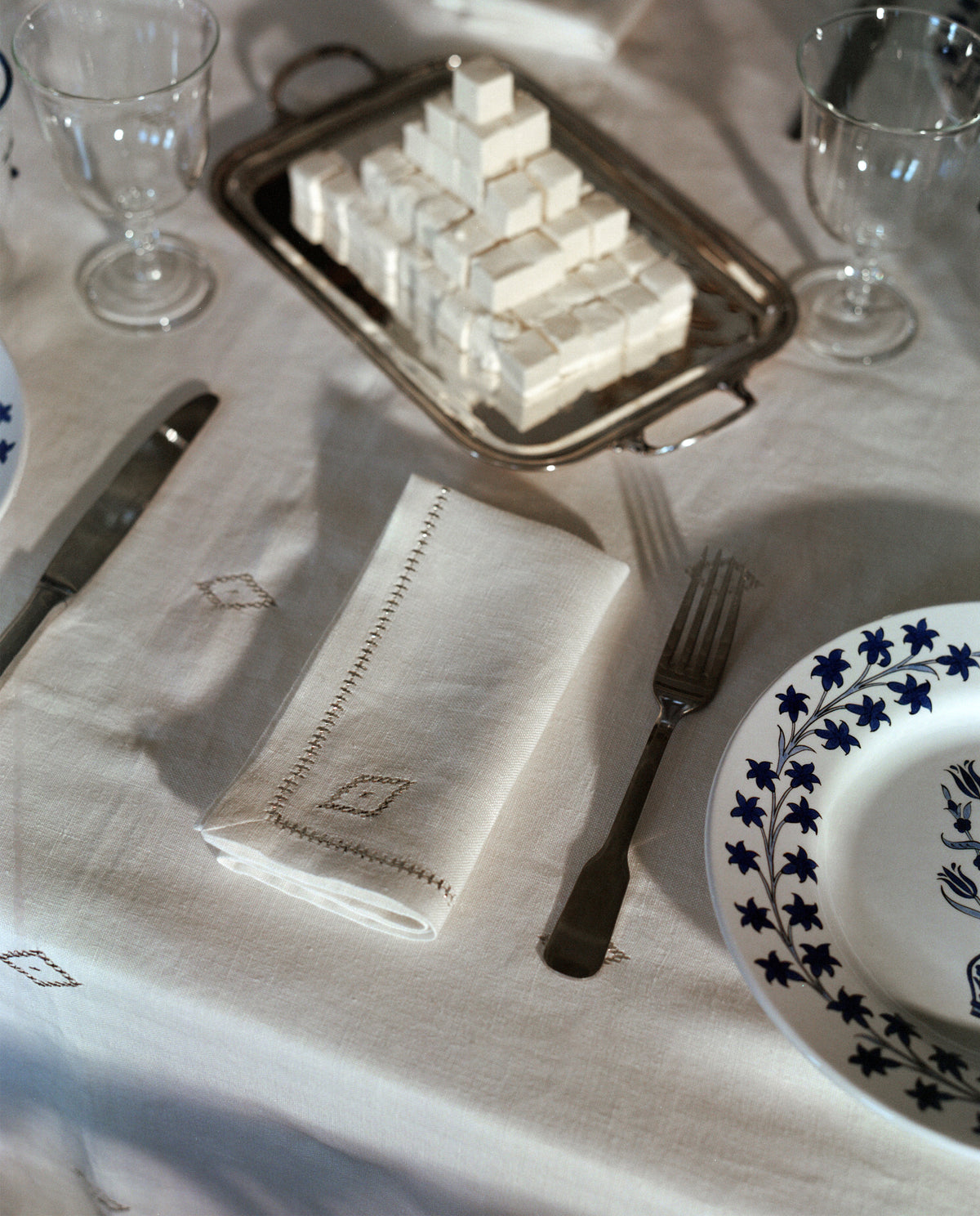The Artemis Napkin brings to life the exquisite craftsmanship of Tarq’, a Levantine embroidery technique that spread across the Eastern Mediterranean basin. Silver is embroidered and then hammered into fabric, traditionally silks and wools. Handmade by a women’s cooperative in the Beqaa Valley, Lebanon that has passed down this craft generationally since 1918, the Artemis napkin features a diamond motif in the corner with a silver border. Made on white Belgian linen.