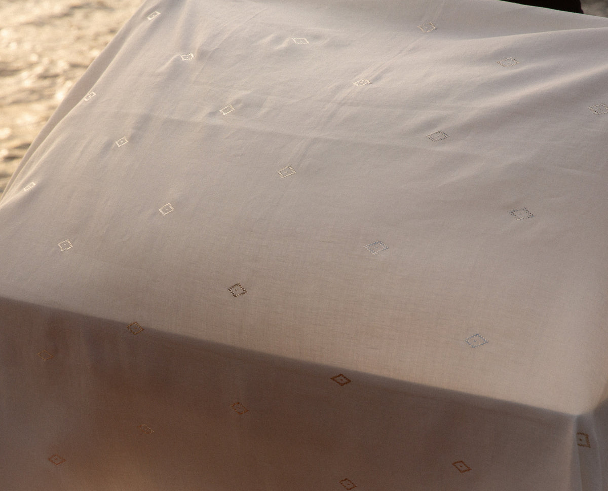 The Artemis Tablecloth brings to life the exquisite craftsmanship of Tarq’, a Levantine embroidery technique that spread across the Eastern Mediterranean basin. Silver is embroidered and then hammered into fabric, traditionally silks and wools. Handmade by a women’s cooperative in the Beqaa Valley, Lebanon that has passed down this craft generationally since 1918, the Artemis tablecloth features a diamond design throughout the textile. Silver on Belgian linen.