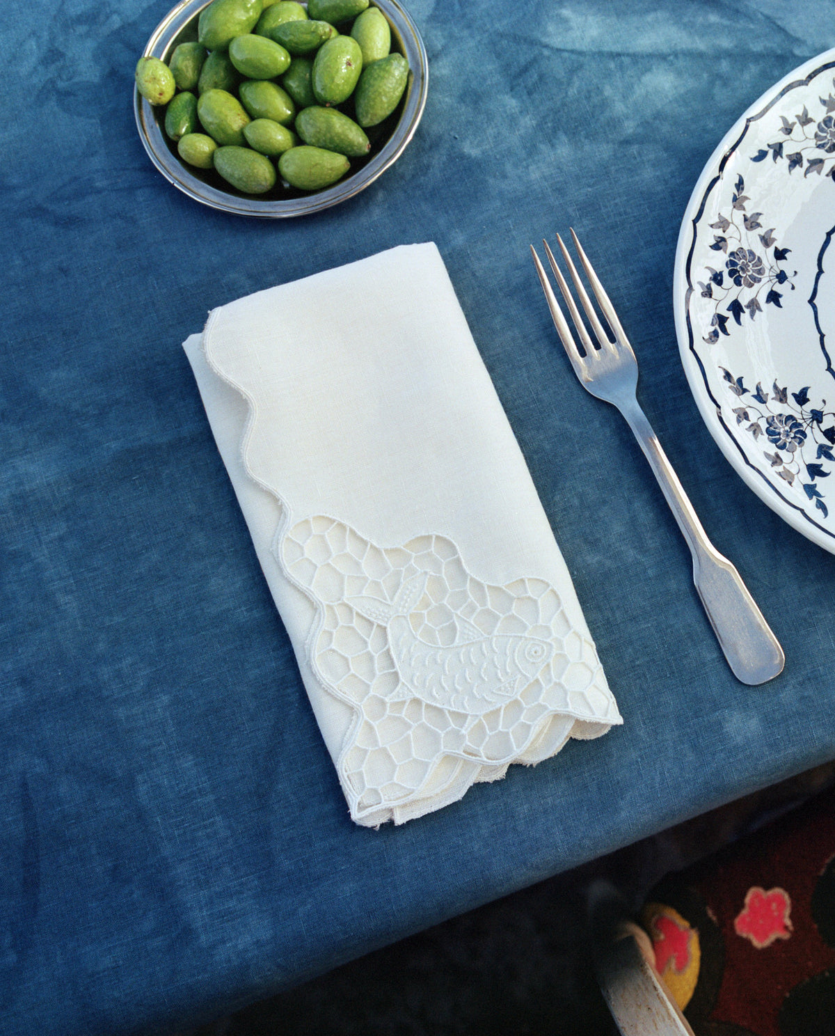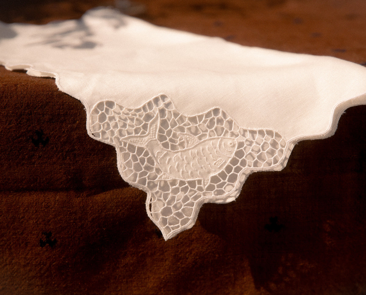 The Balik placemat is LEVANT’s ode to fish restaurants along Istanbul’s Bosphorus boardwalk (sahil). Balık is the Turkish word for fish. Entirely handmade in a historic atelier that specializes in the preservation of Turkish craft, the napkin features a delicate scalloped edge with an open lace fish motif in the corner. Made with Belgian linen.