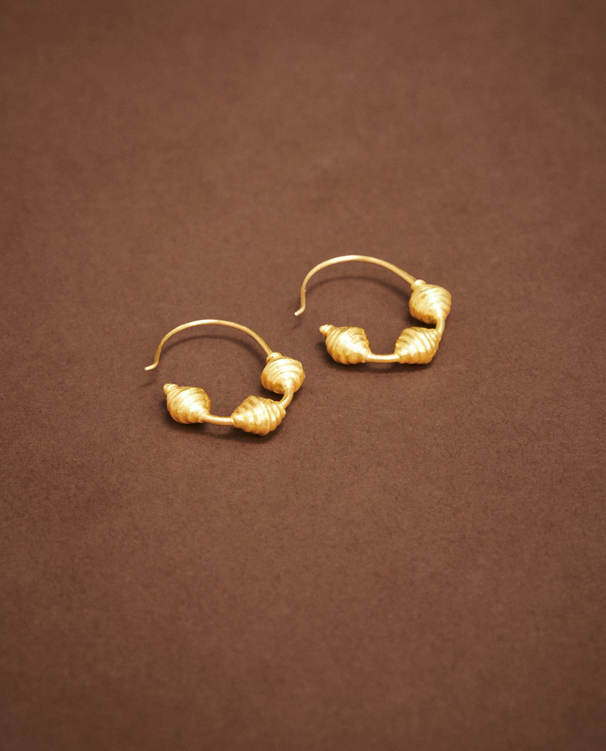 A pair of hoop earrings featuring three hand-wrought conical forms in 24 karat gold.