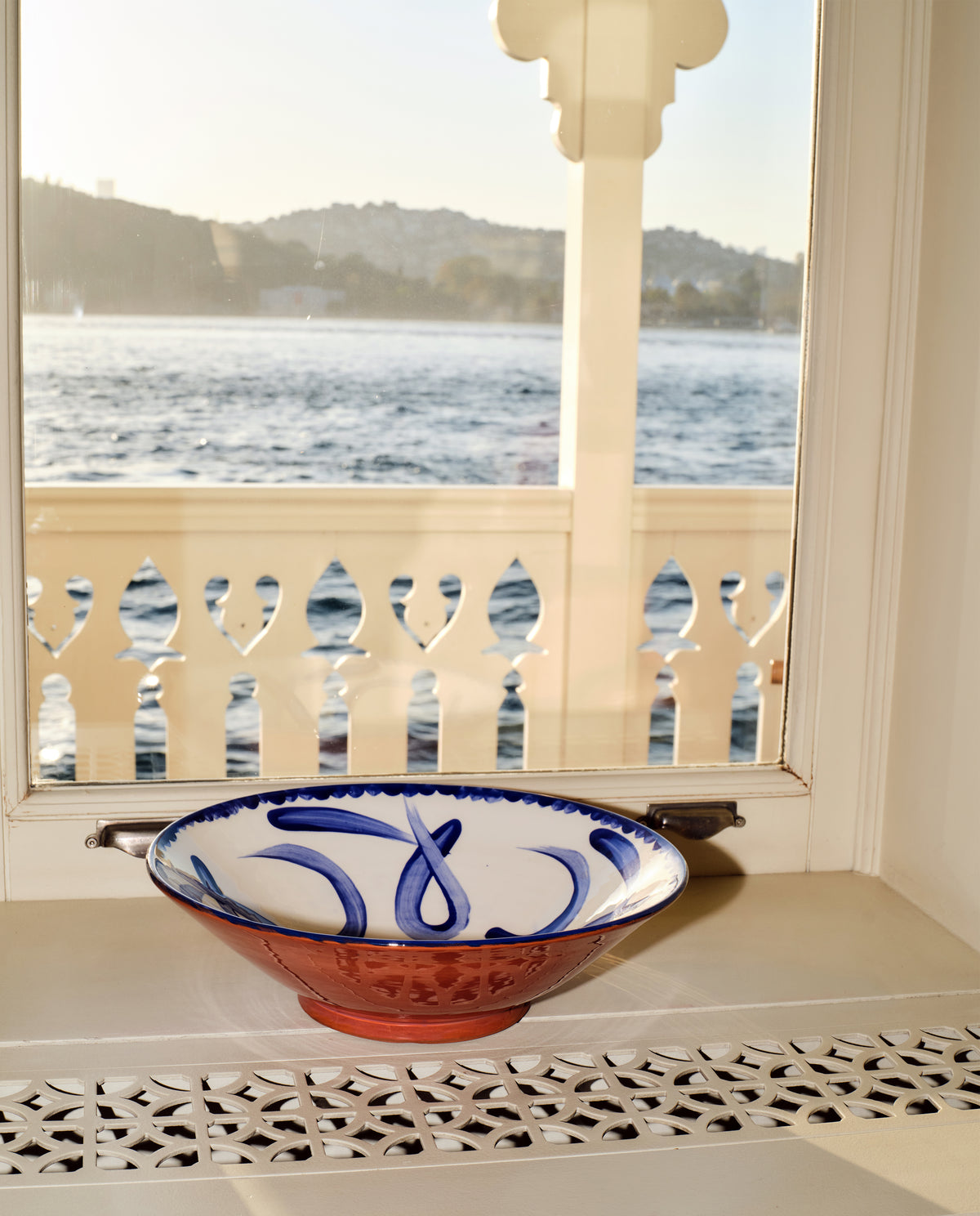 Loosely inspired by the sinuous lines of kufic calligraphy found on 10th century Nishapur ceramics, this red terracotta hand-thrown bowl is set on a small base, featuring a deep conical shape with flaring vertical sides. Made by an Egyptian artisan in the Chouf mountains of Lebanon, the serving bowl is decorated with a central flower surrounded by Arabic lettering.