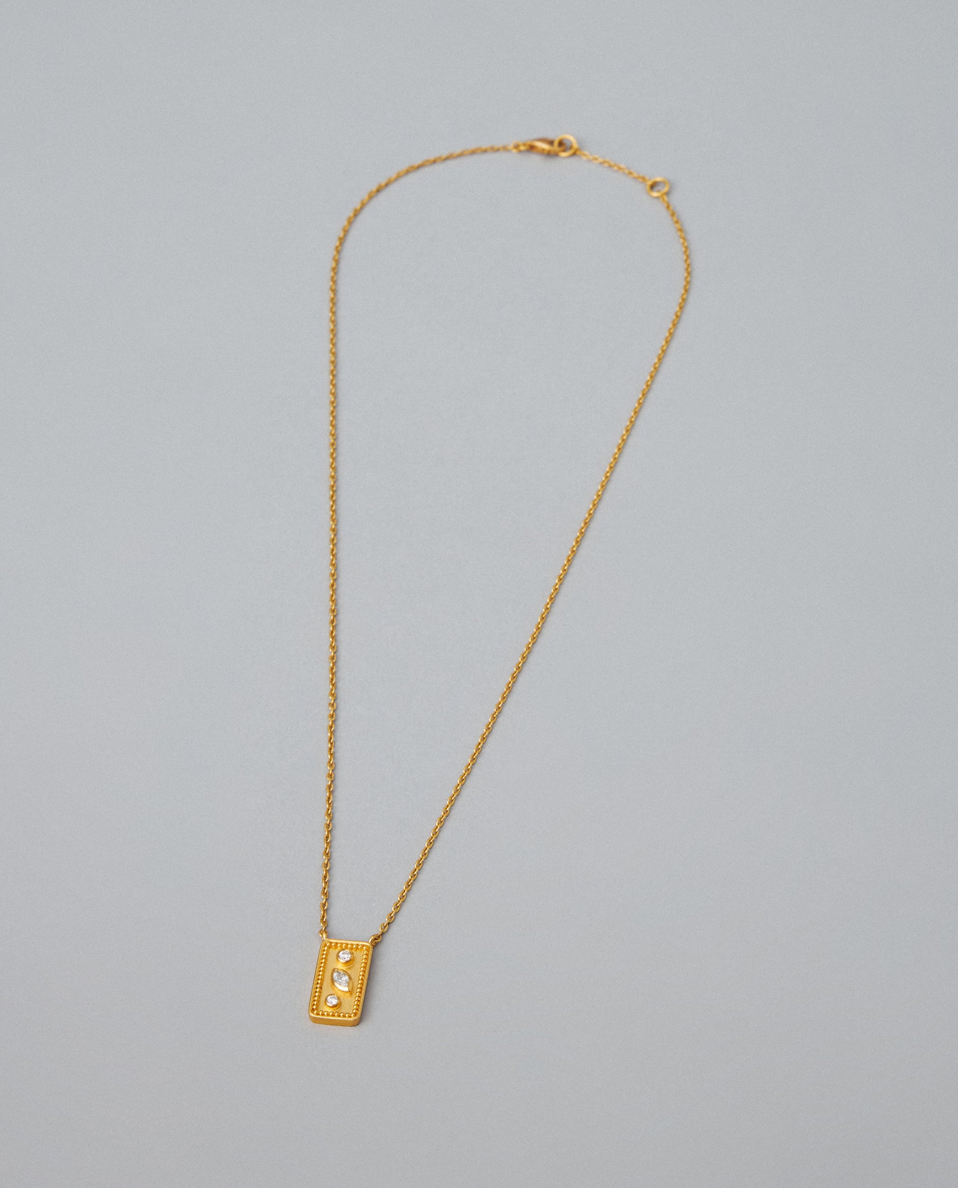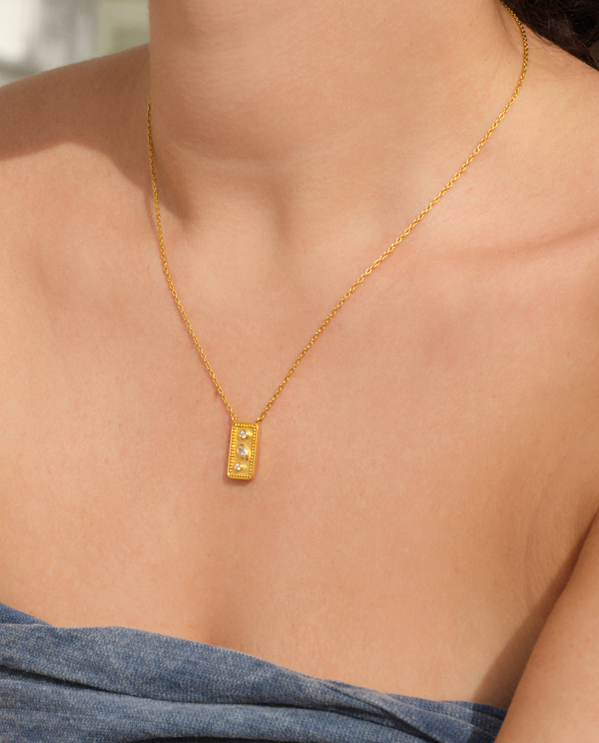 A 24 karat gold pendant necklace with diamonds, inspired by ancient Egyptian cartouches.