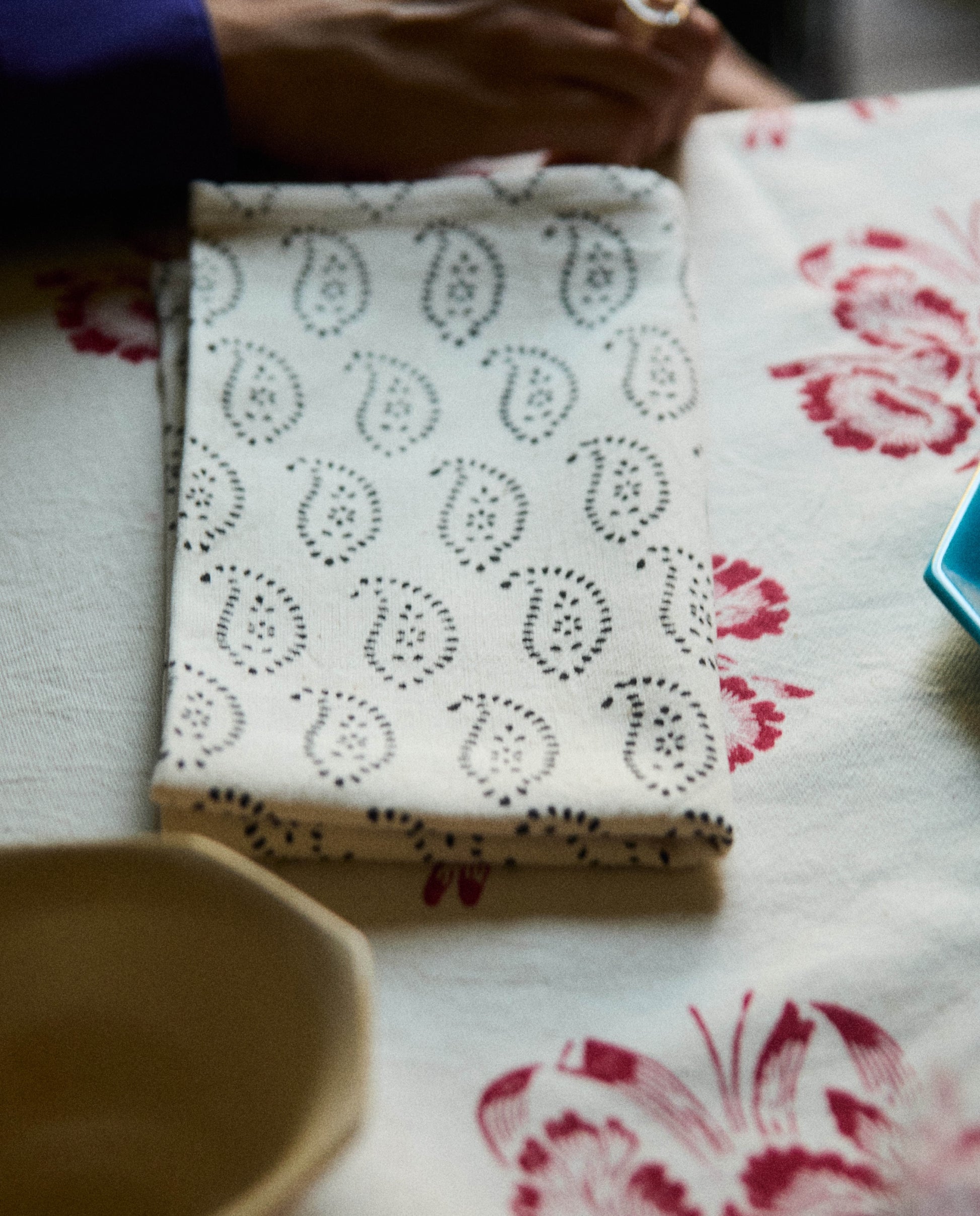 The Esfahan Collection features table linens hand-blocked printed in the city of Esfahan - florals in saffron yellow, indigo blue, peperoncino, and graphic black and white. The Esfahan Napkin features a repeating paisley print in black.