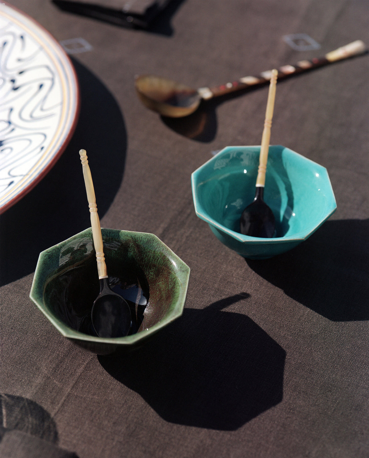 The Gobi Aperitivo Bowls are an ode to the confluence of decorative elements brought about by trade on the ancient Silk Road – from the Gobi Desert to the shores of the Mediterranean. This ceramic bowl features a delicate octagonal shape set on a slight base. Handmade in Istanbul, Turkey.