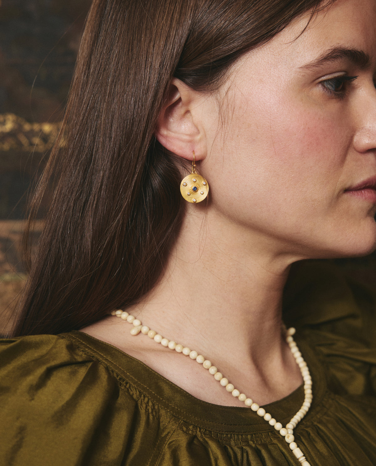 24 karat gold coiled medallions drop earrings, with a central sapphire and diamond dots.