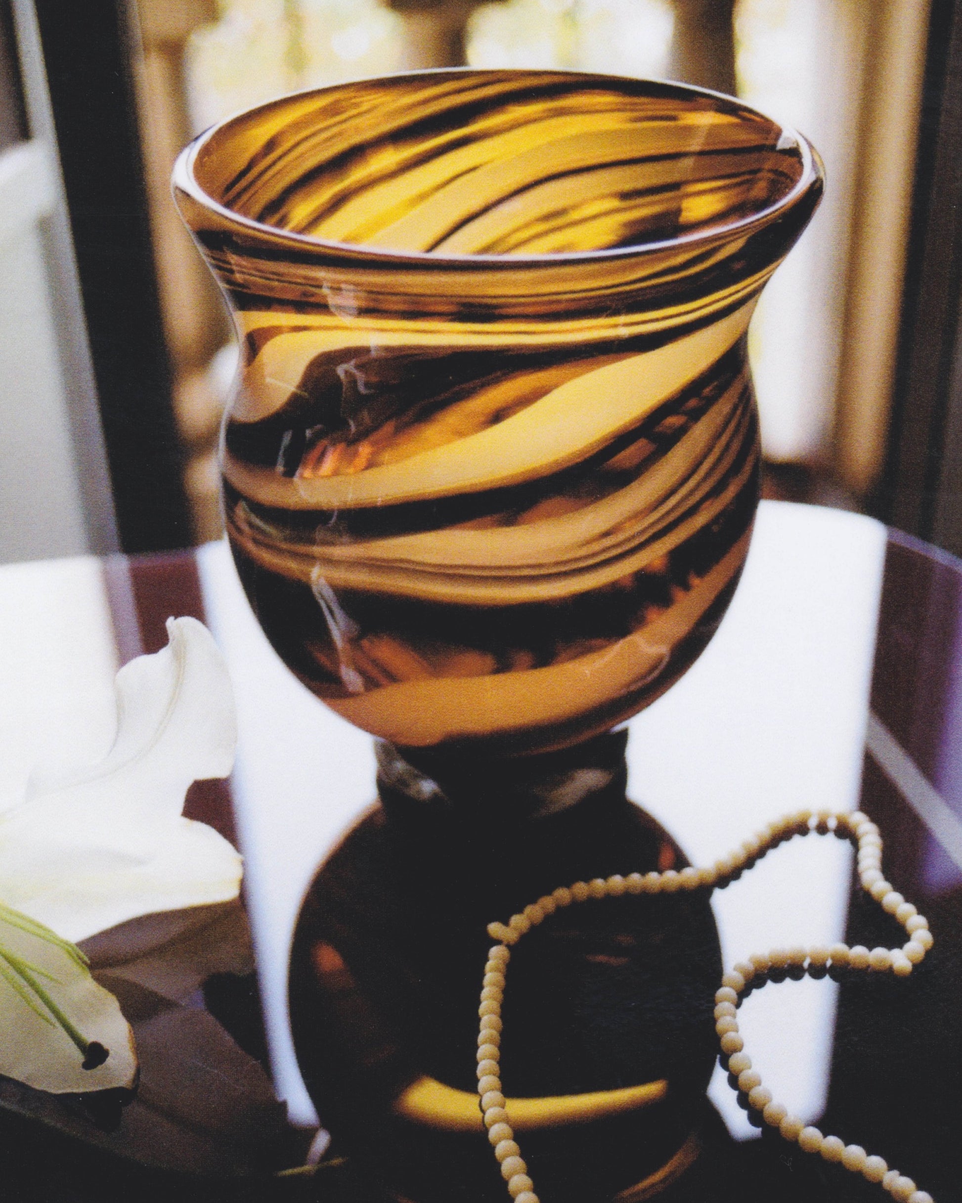Made in Murano, with master glassmakers at Laguna-B. Glass surfaces resemble agate stone with veins of cream, amber, brown, and deep aubergine; a technique rooted in ancient Levantine glass making traditions, and later emulated by Venetian glassmakers. The form is inspired by the silhouette of mosque lamps which, by the Ottoman period, were being produced in Venice and exported to the East. A reflection on the glass making dialogue between the East and the Occident.