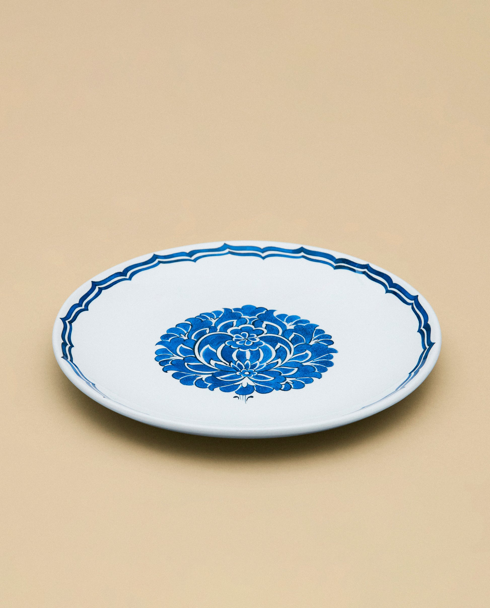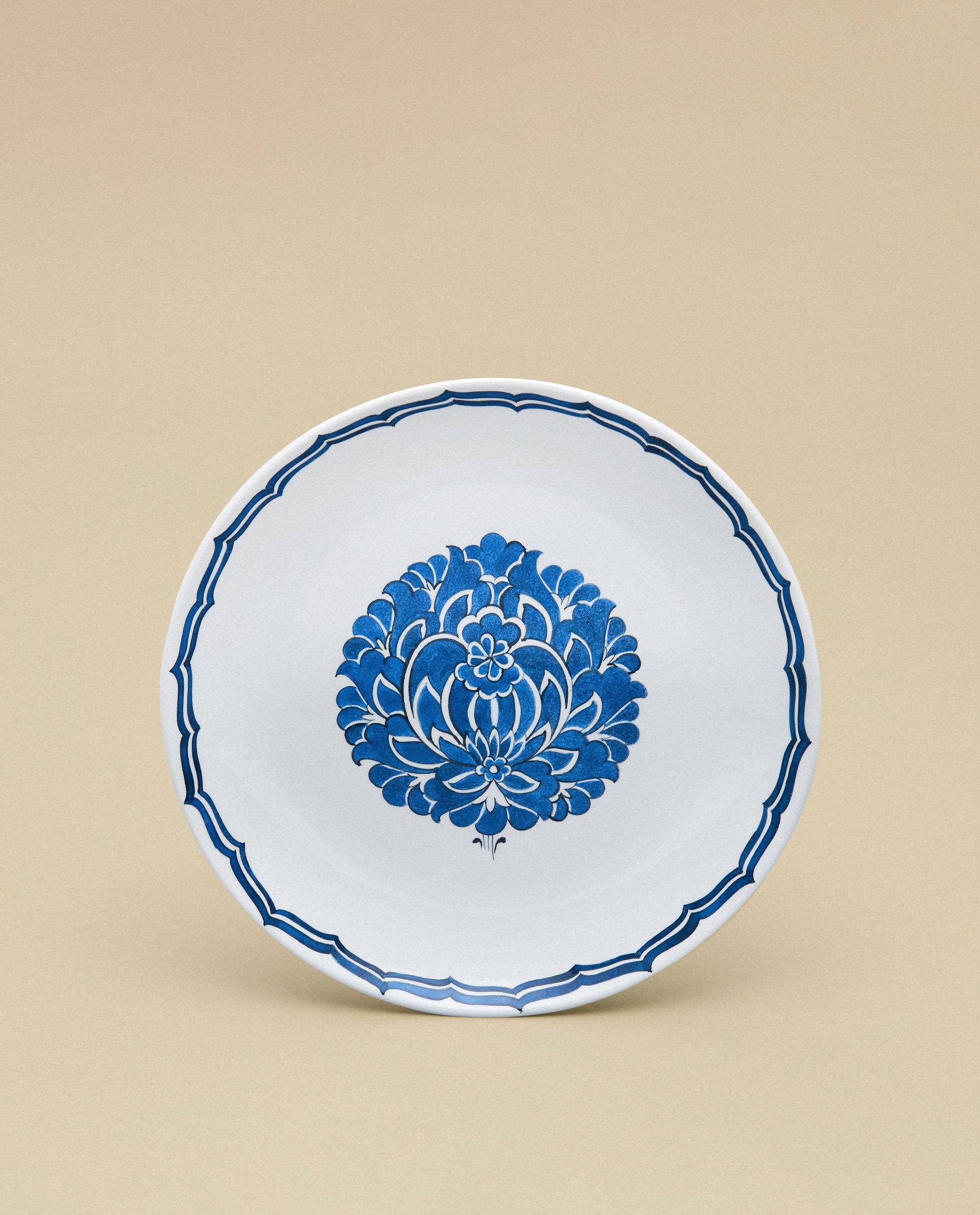 The Lotus dessert plate is inspired by 16th century Iznik designs which were influenced by blue and white Chinese wares imported into the Ottoman Empire. Hand-painted by master artisans in Iznik, Turkey, the dessert plate features a prominent central lotus motif with a double arabesque trim.