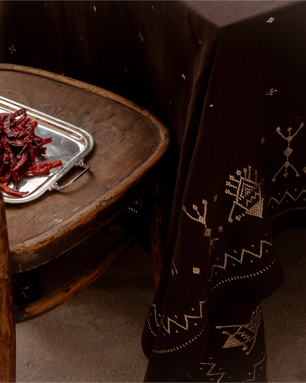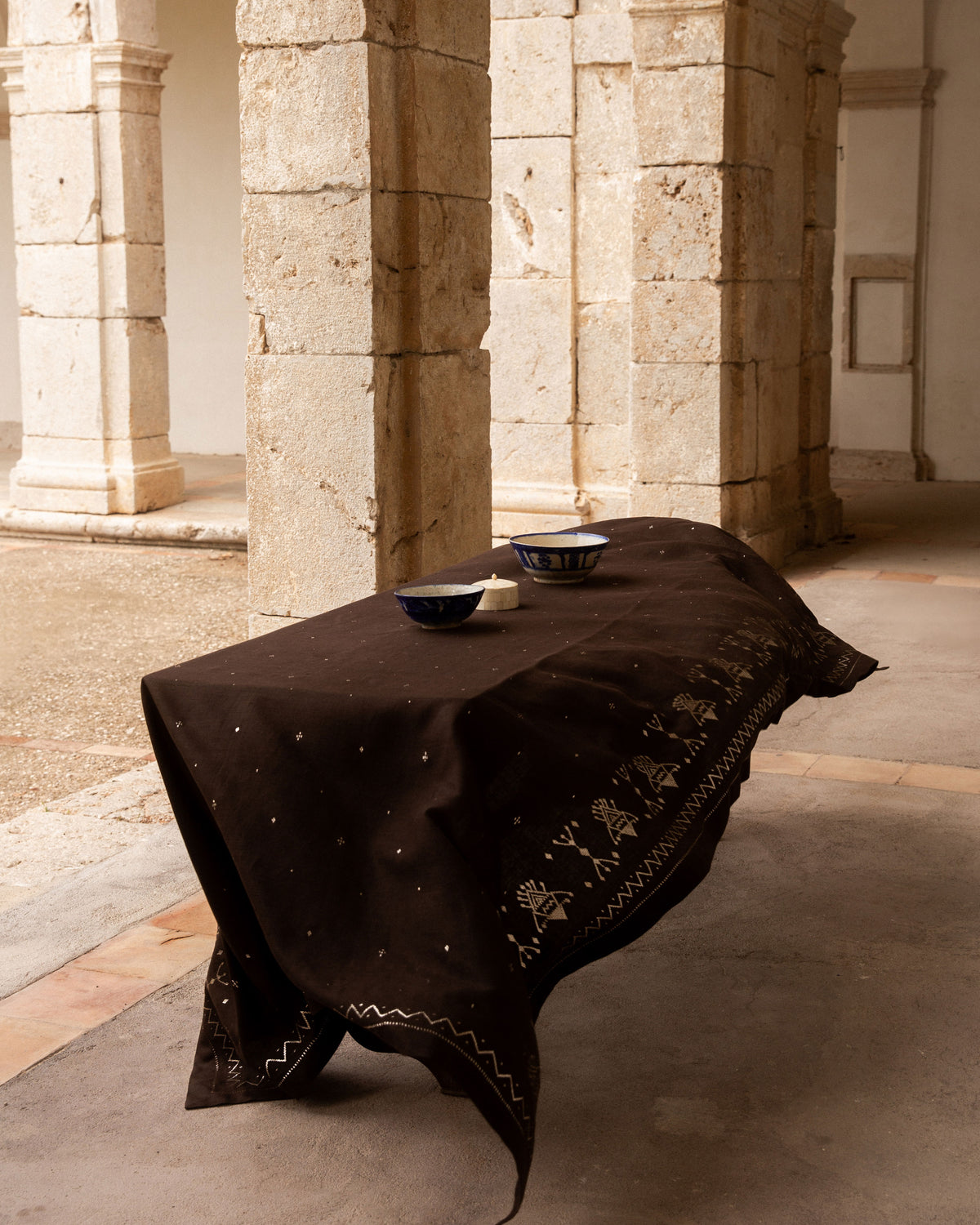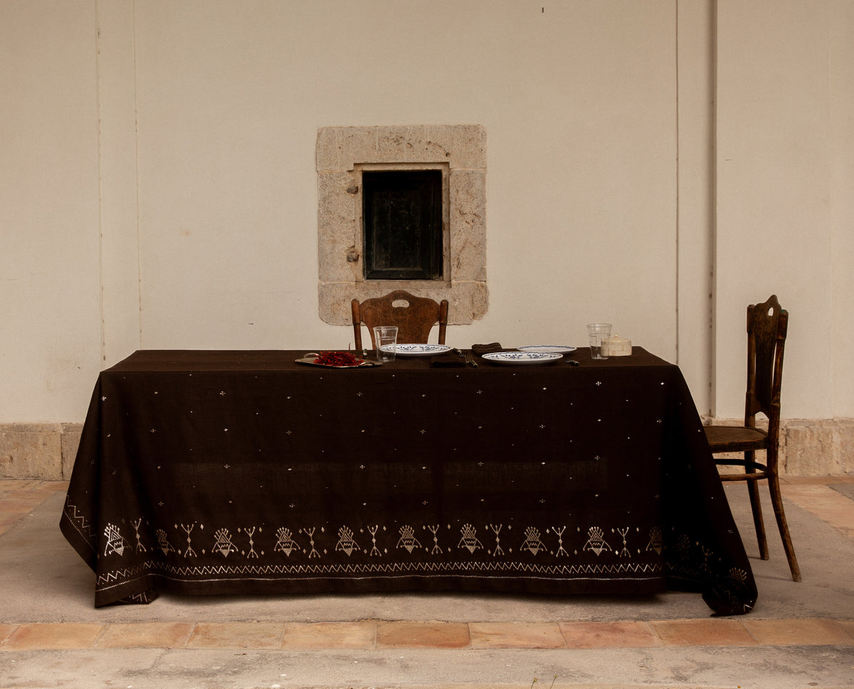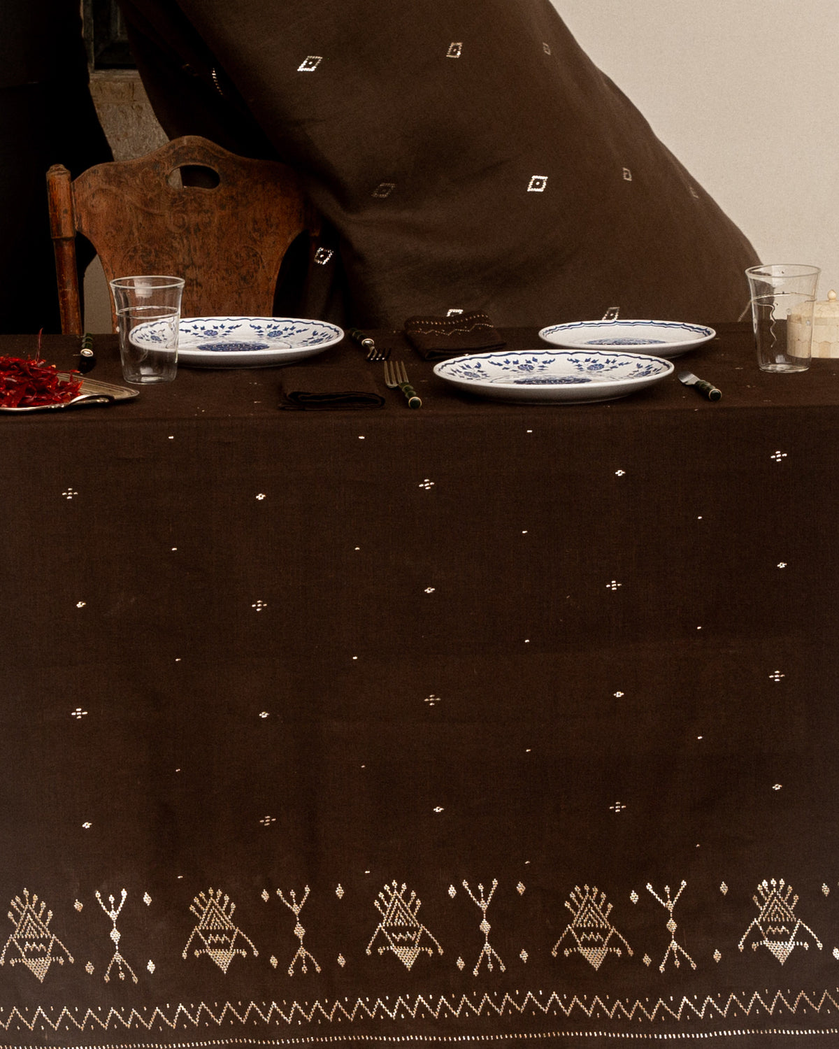 The Palmyra Sky Tablecloth brings to life the exquisite craftsmanship of Tarq, a Levantine embroidery technique that spread across the Eastern Mediterranean basin. Silver is embroidered and then hammered into fabric, traditionally silks and wools. Handmade by a women’s cooperative in the Beqaa Valley, Lebanon that have passed down this craft generationally since 1918, the Palmyra Sky Tablecloth features a Bedouin motif adorning the border and star dots spread across the textile. Silver on Belgian linen.