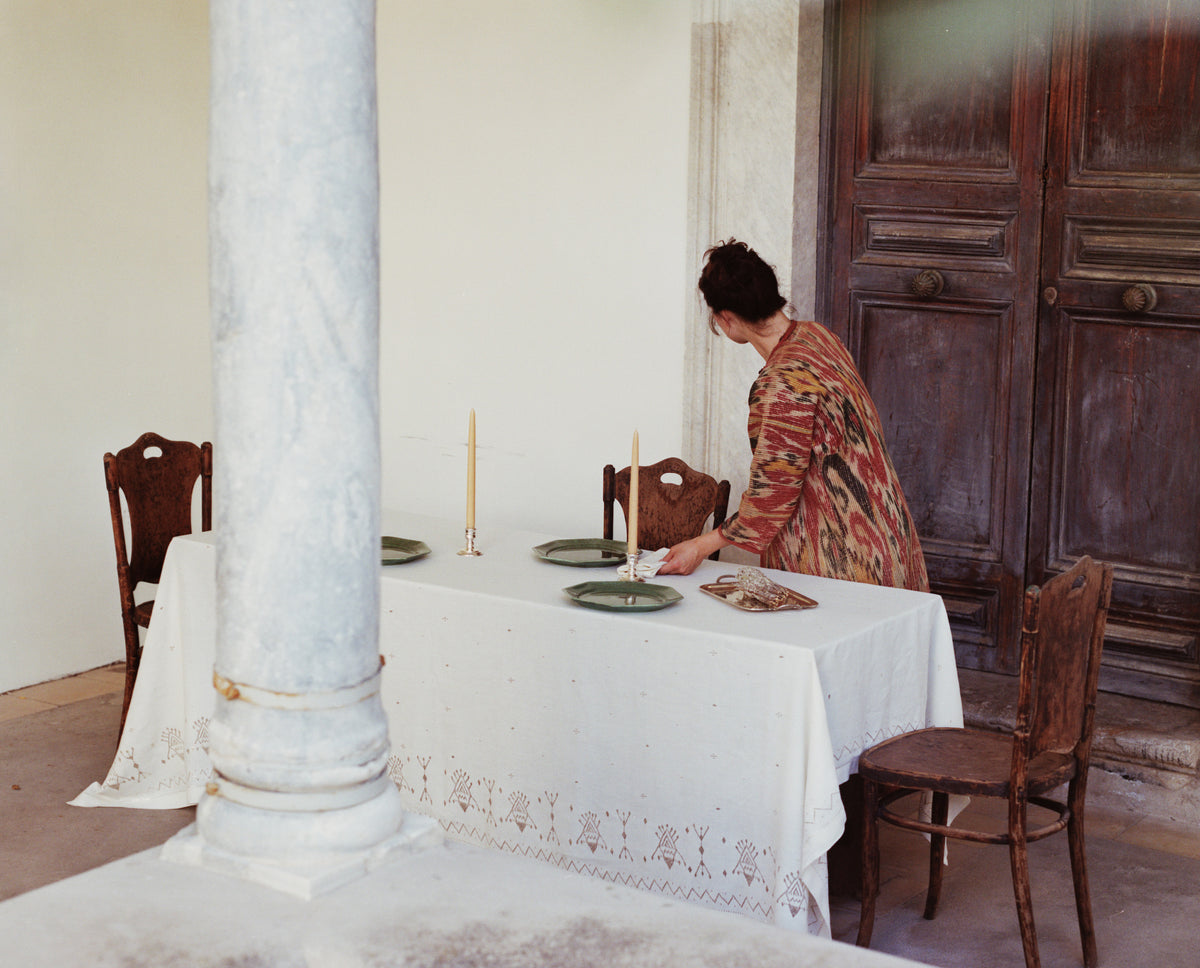 The Palmyra Sky Tablecloth brings to life the exquisite craftsmanship of Tarq’, a Levantine embroidery technique that spread across the Eastern Mediterranean basin. Silver is embroidered and then hammered into fabric, traditionally silks and wools. Handmade by a women’s cooperative in the Beqaa Valley, Lebanon that have passed down this craft generationally since 1918, the Palmyra Sky features a Bedouin motif adorning the border and star dots spread across the textile. Made on white Belgian linen, the combination of silver on white is celestial, and dramatic by candlelight.