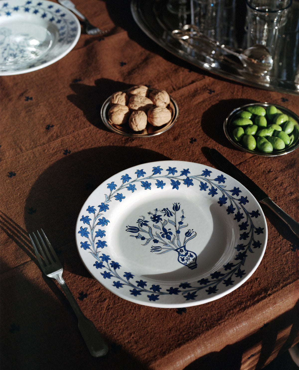 The Paradiso plate is inspired by an Iznik tile motif from the 16th century. Reimagined with strong ties to the original design, the plate features a central vase motif with tulips and leafy sprigs, and is bordered by a vine of small flowers on a raised lip. Hand-painted by master artisans in Iznik, Turkey, once the center of ceramic tile production during the Ottoman Empire.
