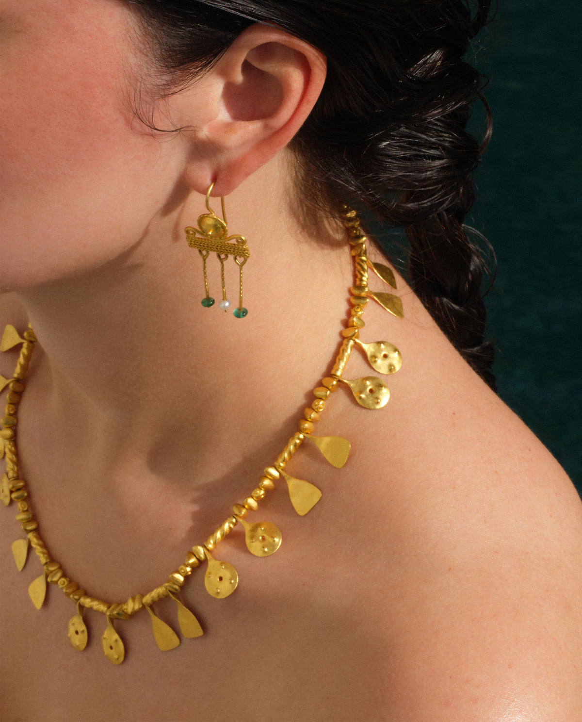 A dramatic collar necklace of 24 karat gold, featuring hanging idols inspired by the motifs of the ancient Hittites.