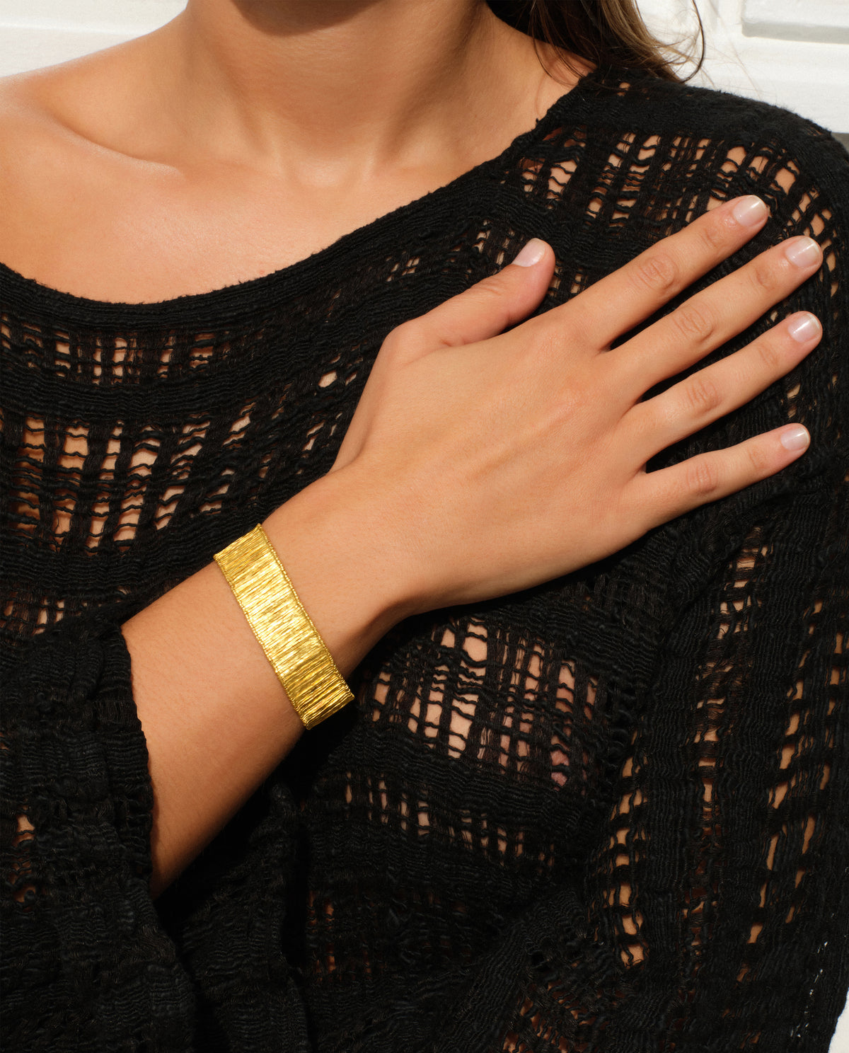 A 24 karat gold fringe cuff, inspired by Priam’s Treasure, an assemblage of artifacts from the 3rd century BC found at the ancient city of Troy. The gold jewelry was infamously stolen by German archaeologist Heinrich Schliemann during his excavation of Troy, located in modern day Turkey.