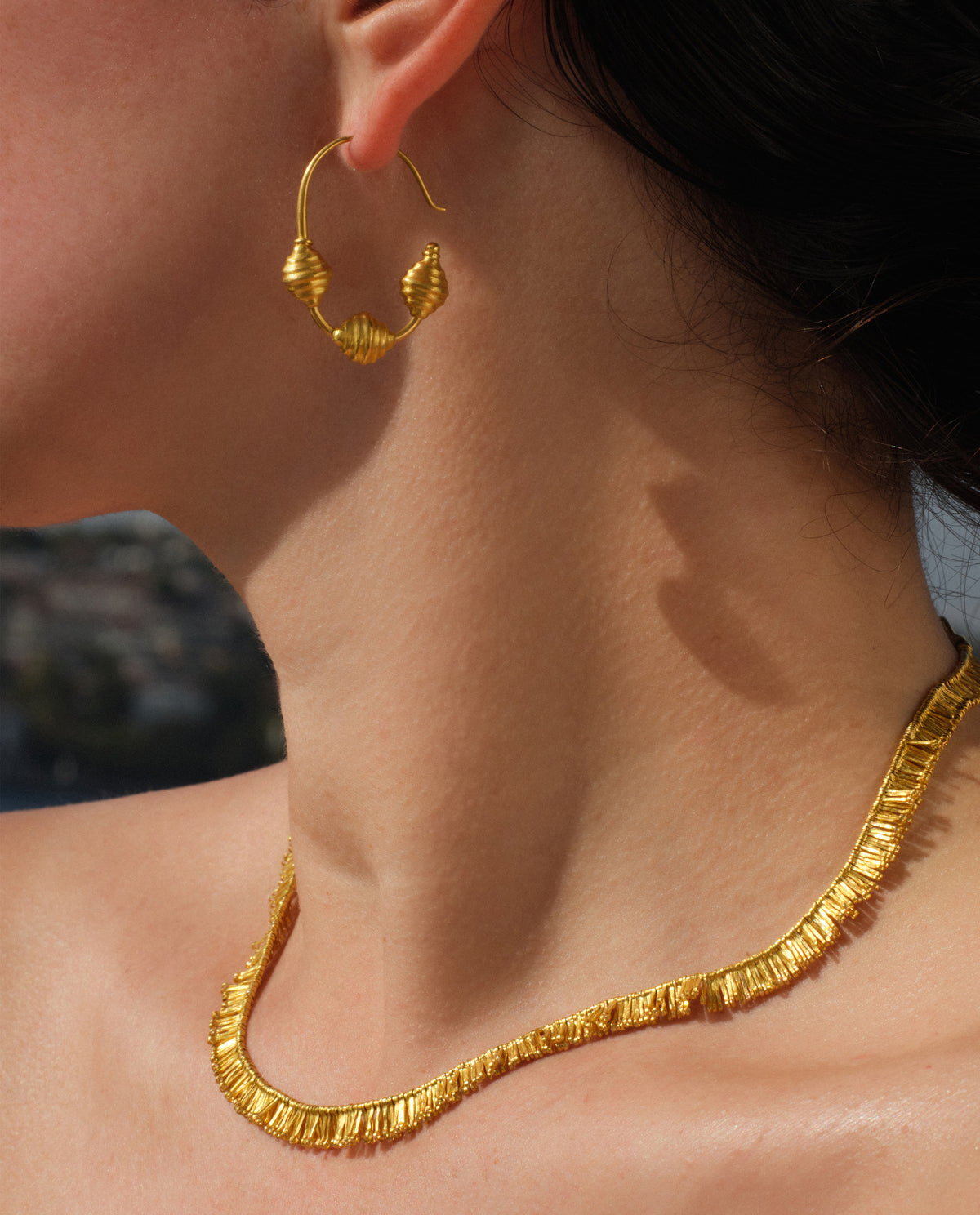 A 24 karat gold fringe necklace, inspired by Priam’s Treasure, an assemblage of artifacts from the 3rd century BC found at the ancient city of Troy. The gold jewelry was infamously stolen by German archaeologist Heinrich Schliemann during his excavation of Troy, located in modern day Turkey.
