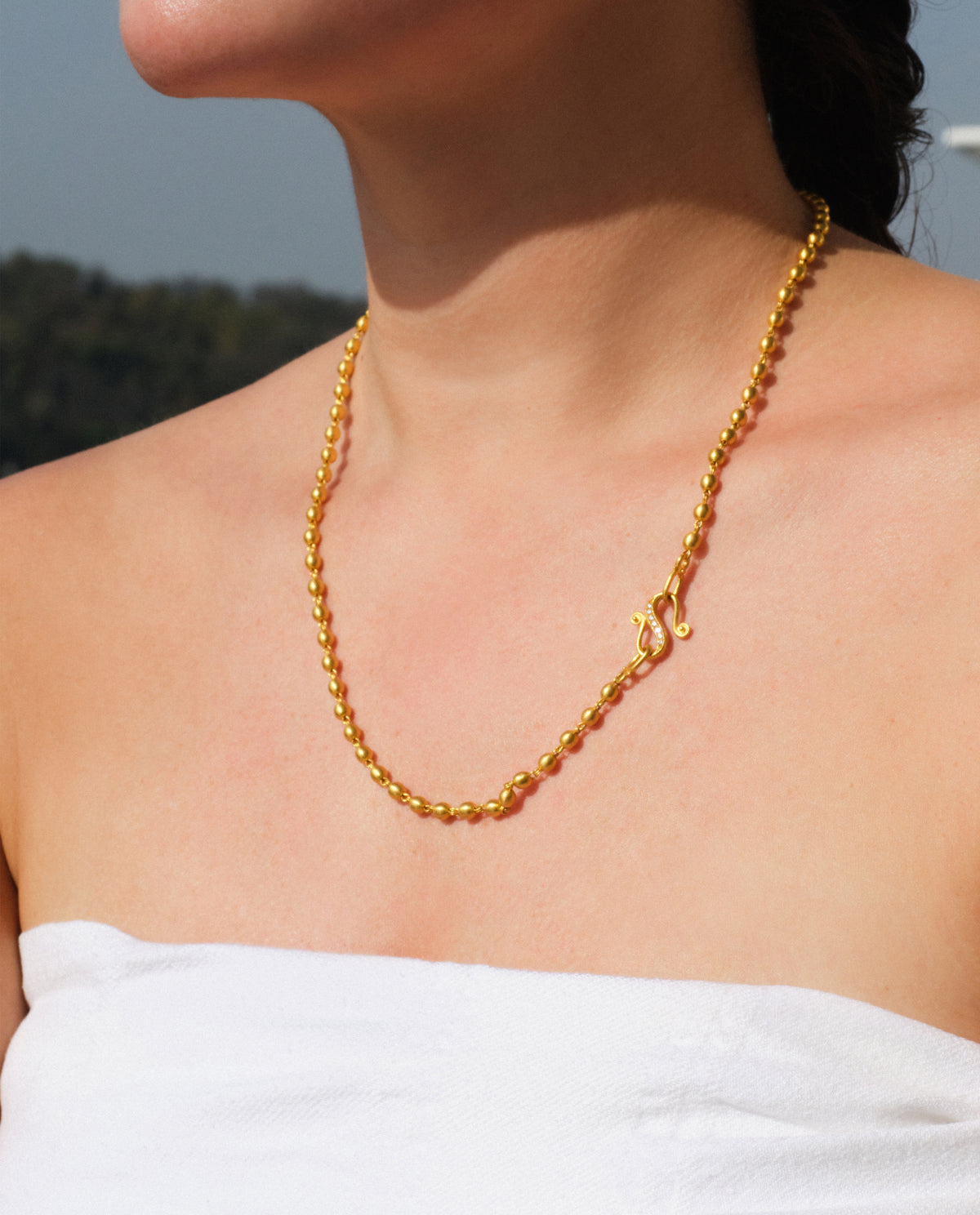 A 24 karat gold linked ball chain adorned with an S form clasp in diamonds.