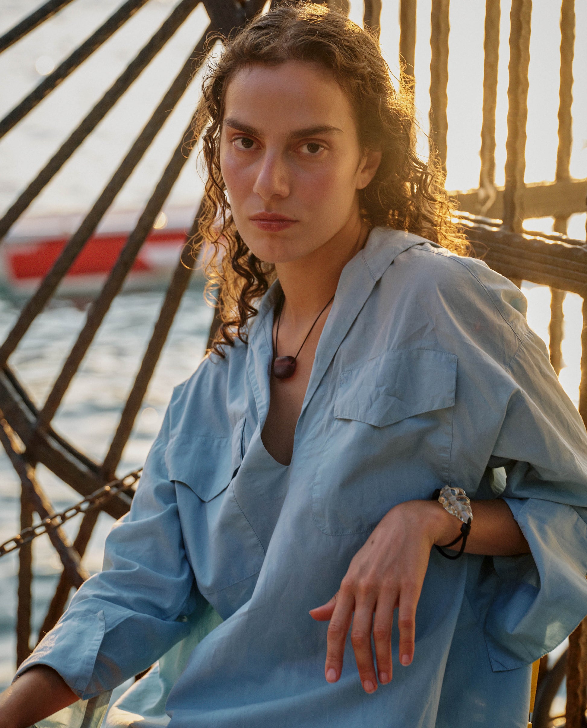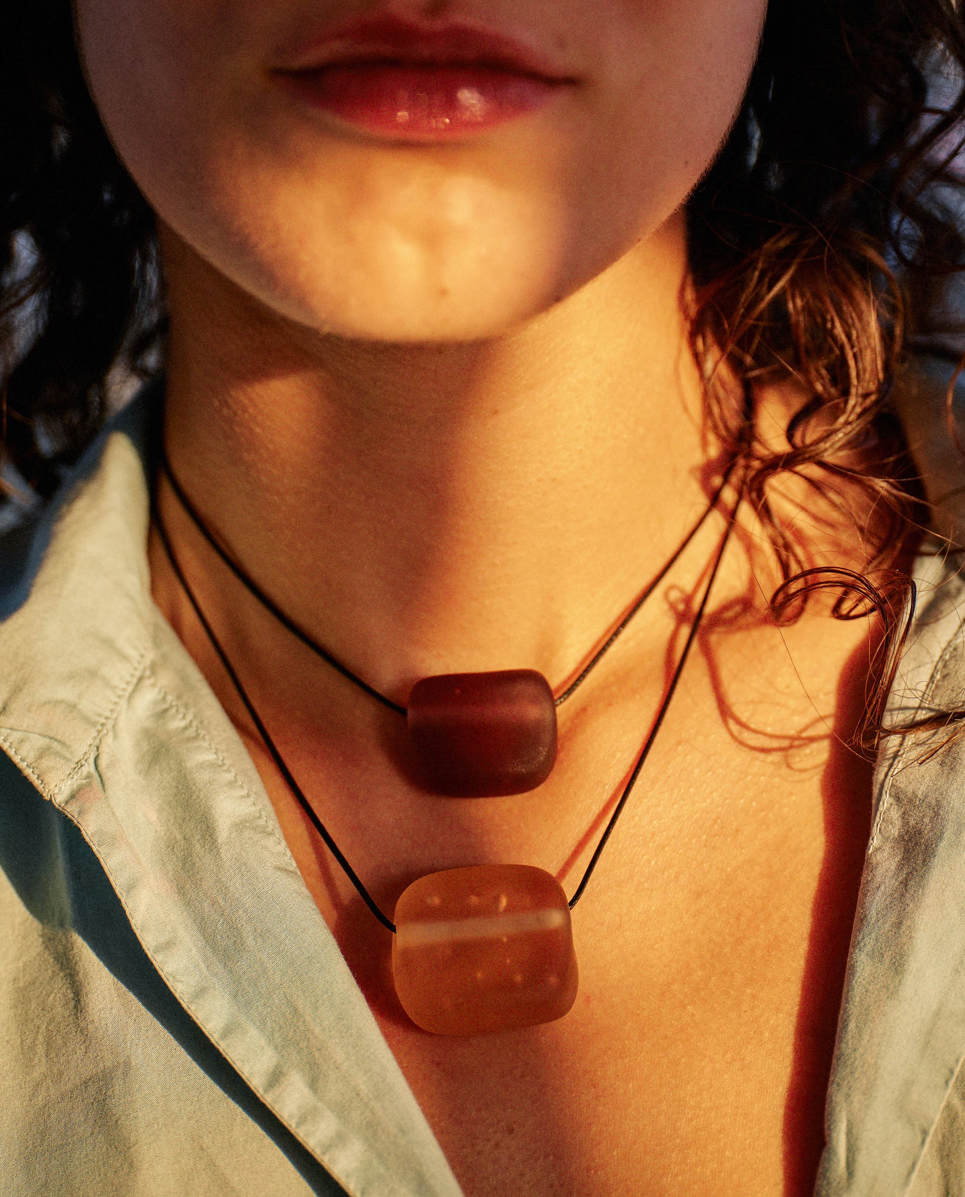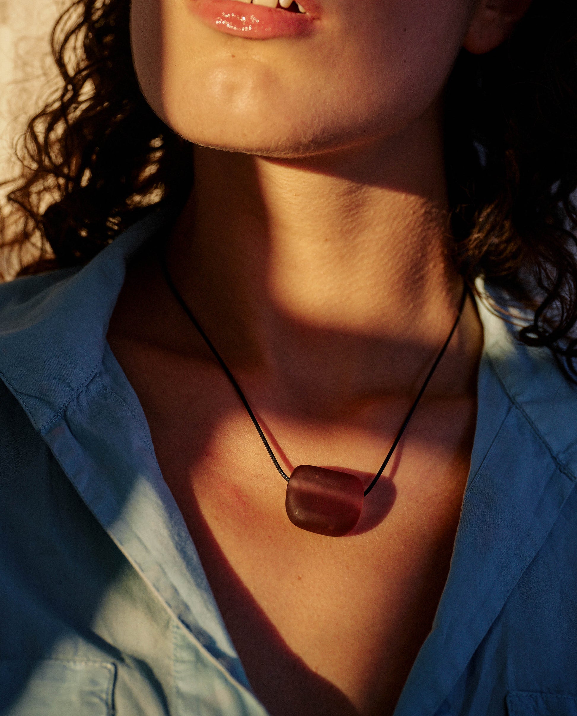 Inspired by the ancient art of glassmaking, the Sea Stone Collection evokes stones of the sea, in semi-translucent and glowing pinks, aubergine, amber, green and translucent water-like rock. Designed in collaboration with glass artist Gennaro Pepe, each piece is finished with custom silver closures handcrafted in Italy.