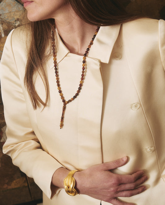 Inspired by the ancient art of glassmaking, the Sea Stone Collection evokes stones of the sea, in semi-translucent and glowing pinks, aubergine, amber, green and translucent water-like rock. Designed in collaboration with glass artist Gennaro Pepe, each piece is finished with custom silver closures handcrafted in Italy.