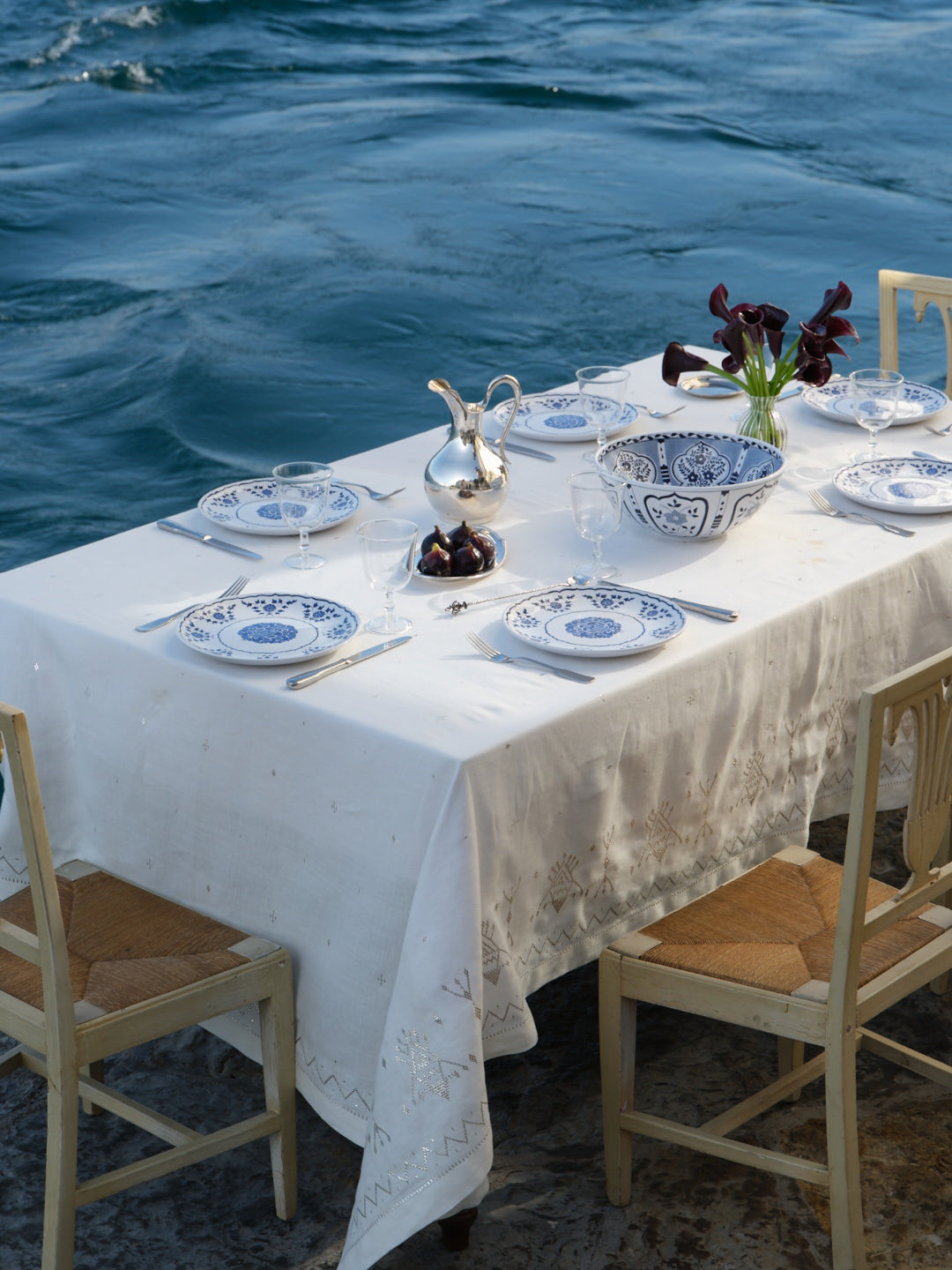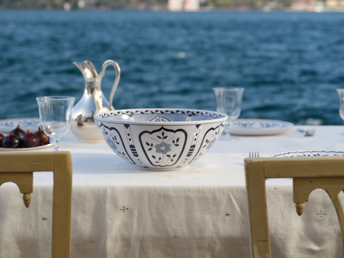 The Seraglio Bowl is an 18th century blue-and-white design from Kütahya, Turkey, recreated by a historic workshop in Iznik, once the center of ceramic production during the Ottoman Empire. The soft blue and white palette of the bowl and its design of radiating panels enclosing floral motifs is reminiscent of Chinese porcelain wares, which had an unparalleled influence on taste across the Islamic world.