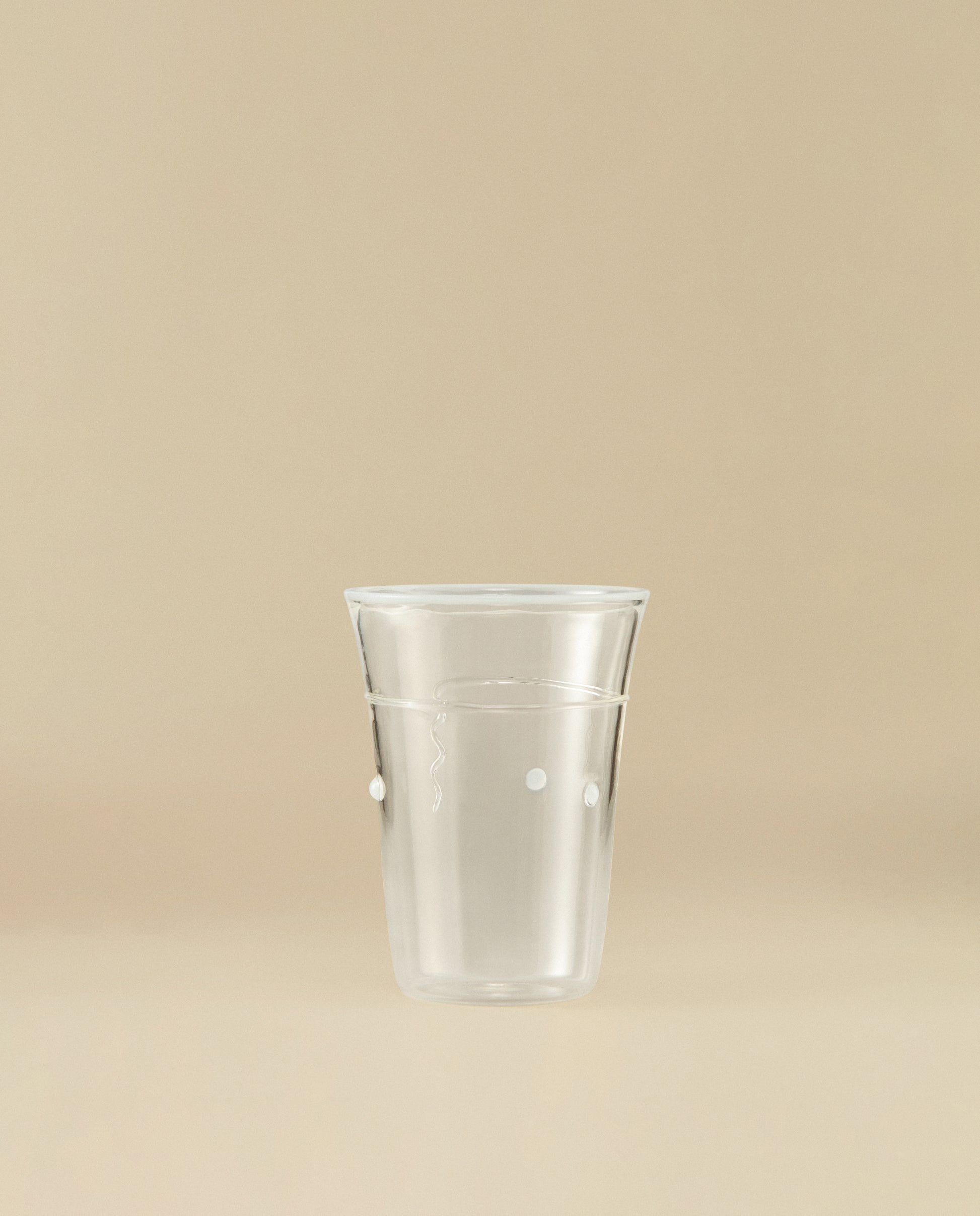 The Vesper Glass is inspired by the form of a Syrian drinking vessel, which would have been widely exported throughout the Islamic World in the 12th century. Its execution inspired the first enameled glasses created by Venetian artisans in the 13th century. Hand-blown in Beykoz, a village in Istanbul renowned for its glassmaking, the Vesper features a flared cylindrical shape, and is accented by glass droplets and a colored rim in opaque white.